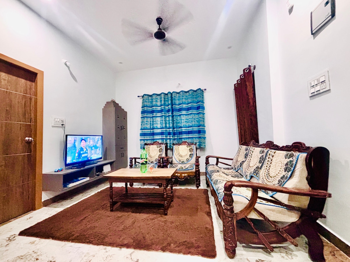 This spacious, clean and tastefully furnished first floor house offers a comfy and convenient base for seeing Mysore. It has a king size bed in bedroom with A/c and attached bathroom/toilet, dining room and kitchen, Living room has smart TV, sofa + a single bed and private roof terrace. WiFi speed is 100 mbps. Street car parking in front of our house is available.