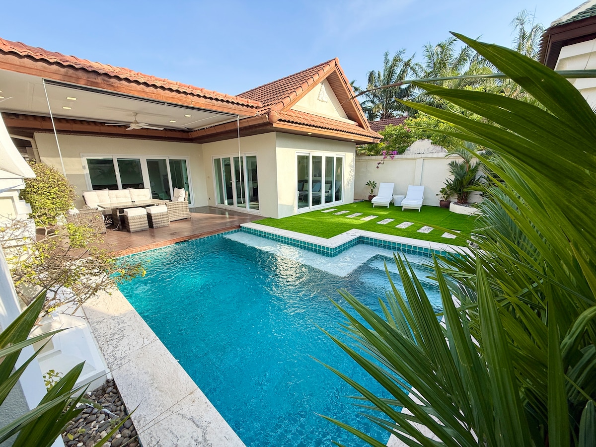 Modern 2-bed villa in a peaceful Jomtien community, only 700m from the beach. Enjoy a private plunge pool in a tropical garden, large sliding doors for open-air living, spacious kitchen, fast Wi-Fi, a 75” TV with sound bar and TVs in both bedrooms. Set in a quiet, popular development yet close to beach life, restaurants, massage shops, bars, cafés and other key amenities. Ideal for couples, families or remote workers seeking comfort and convenience in Pattaya’s popular coastal area.