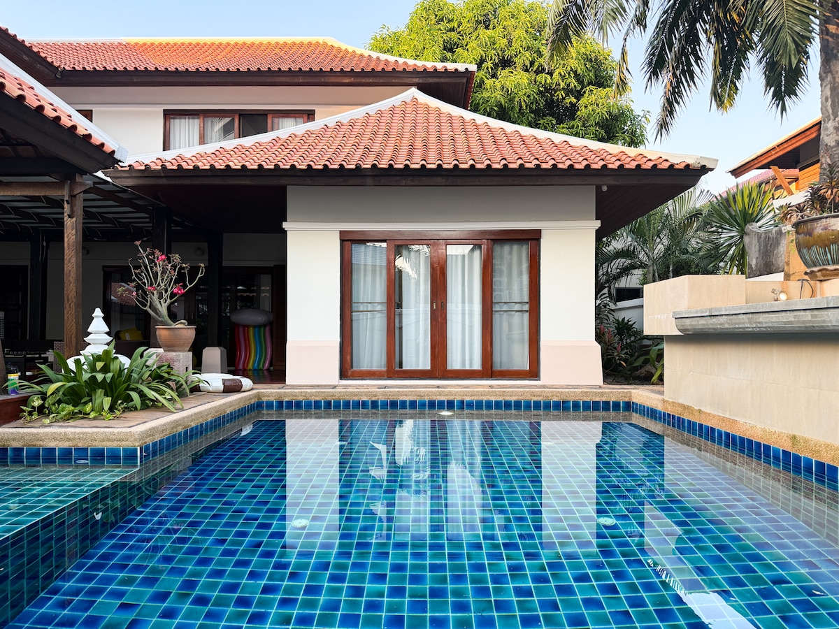 *Note - no service fees* Beautiful 2 bedroom, 2 bathroom villa with secluded private pool and garden. The property includes a fully fitted kitchen, living room, dining area and beautiful relaxing garden. All internal rooms have separate air conditioning units, ceiling fans, TV's and a fibre optic wifi connection is provided. The villa is located within a secure compound, in a vibrant area only 500m from Jomtien Beach. We guarantee an absolutely private stay. No sharing, no disturbances.