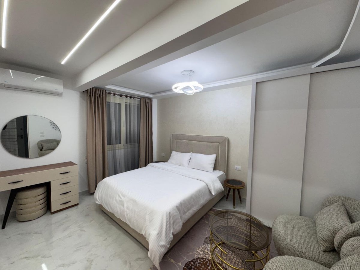 Kick back and relax in this calm, stylish space. Brand-new luxury apartment in peaceful Montazah with premium renovation and modern design. Ground floor with direct terrace to shared pool-step out for a swim!Great pool views. Rooftop pool with panoramic Red Sea views 5-min walk to beach 5-min drive to SOHO Square (restaurants,bars,shopping,shows 70 m²:1 bedroom(sleeps 2),open living+full kitchen (new appliances+washer Fast Wi-Fi,Smart TV, AC,free parking,secure complex. + Sharm Guide❤️