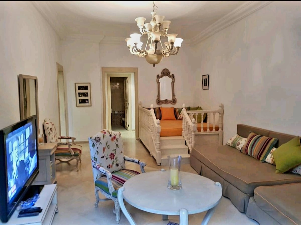 L'appartement est au rez de jardin de la résidence khomsa climatisé en été et chauffé en hiver,il est situé à la rue de Nevers devant l'hôtel Miramar et collé au café l'eldorado, il comporte: 2 chambres à coucher avec un litking size et 2 lits individuels;- une cuisine bien équipée;-une salle d'eau;-un salon avec un canapé et 2 fauteuils,une télévision, une table à manger et un espace de travail dédié et enfin une grande terrasse donnant sur le jardin.