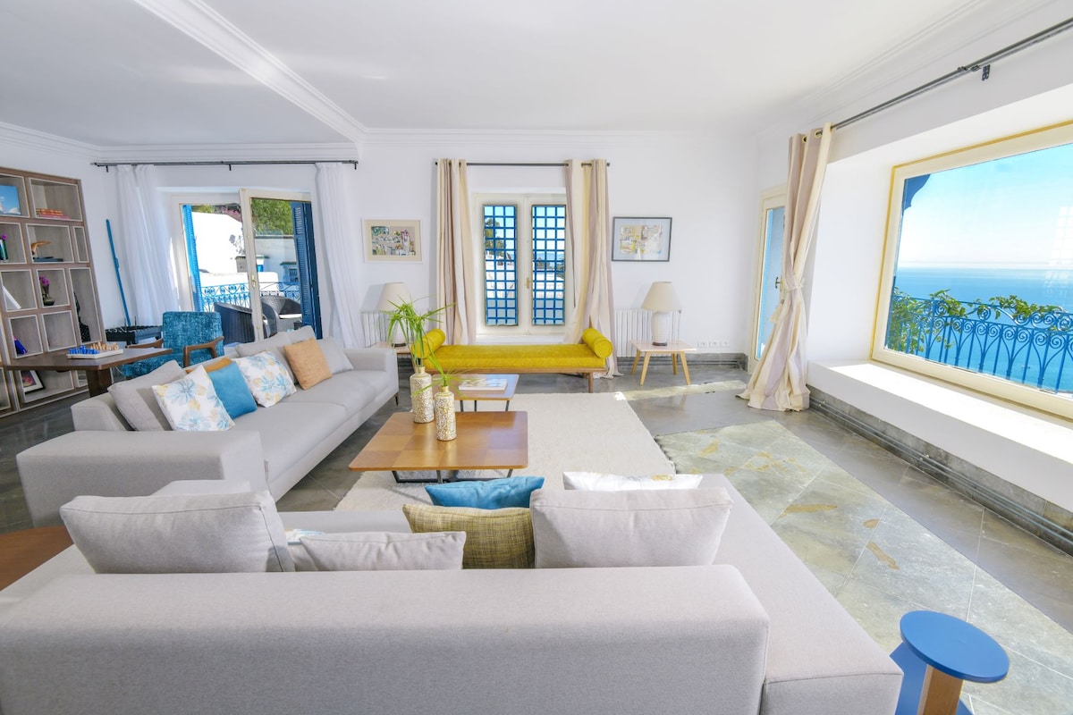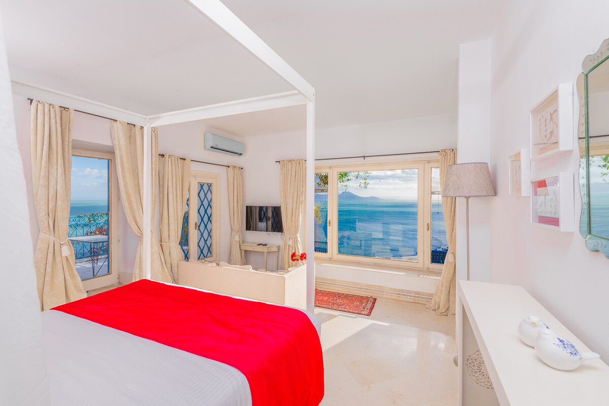 Dans la Suite Persane aux motifs délicats, votre regard s’ouvre sur des baies vitrées embrassant l’horizon chatoyant de la Méditerranée. Chaque fenêtre révèle un tableau vivant où la lumière sublime la pureté des couleurs et les courbes majestueuses de la côte. Au pied de la villa, les voiles du port de plaisance dansent sur l’eau, offrant un spectacle apaisant et inoubliable, entre élégance orientale et panorama d’exception.