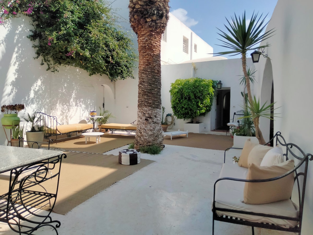 Charmante bungalow, totalement indépendante. Le bungalow est une annexe attachée à une villa historique dans de style arabe, située dans un quartier calme, proche de tous les services et à quelques minutes de la Médina, de la zone touristique et des merveilleuses plages blanches d'Hammamet. La suite est soignée dans les moindres détails pour garantir un séjour de détente totale et de soins. Parfait pour un couple ou pour une famille de 4 personnes.