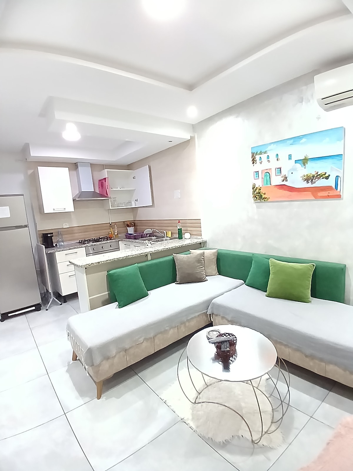 Situé au coeur de Hammamet nord . Au premier étage d’un immeuble , idéalement situé à deux pas de la route tousistique nord , de ses plages et du Palais des Festivals, charmant appartement de 100 m2 et entièrement rénové. Très bien aménagé et optimisé. Cuisine toute équipée ouverte sur le salon,ne suite parentalet et une chambre (2 lits simple) et sa salle de bain. Wifi, climatisation.