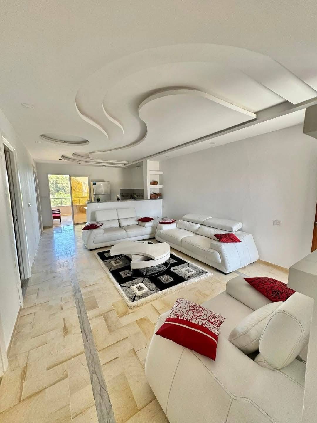 Nous vous proposons un splendide appartement a Hammamet Nord une résidence trés securisée à 5 minute de la plage il se compose d'un salon & cuisine tous est à l'état neuf qualité prémium et deux chambre avec dressings doté d'une fenetre vue sur piscine et d'une salles de bain avec douche italienne dwifi gratuit. La résidence est équipé de caméra de surveillance est un place ou vous pouviez garé votre voiture devant la résidence .Une salle de sport est à proximité à 300 mètres de la résidence .