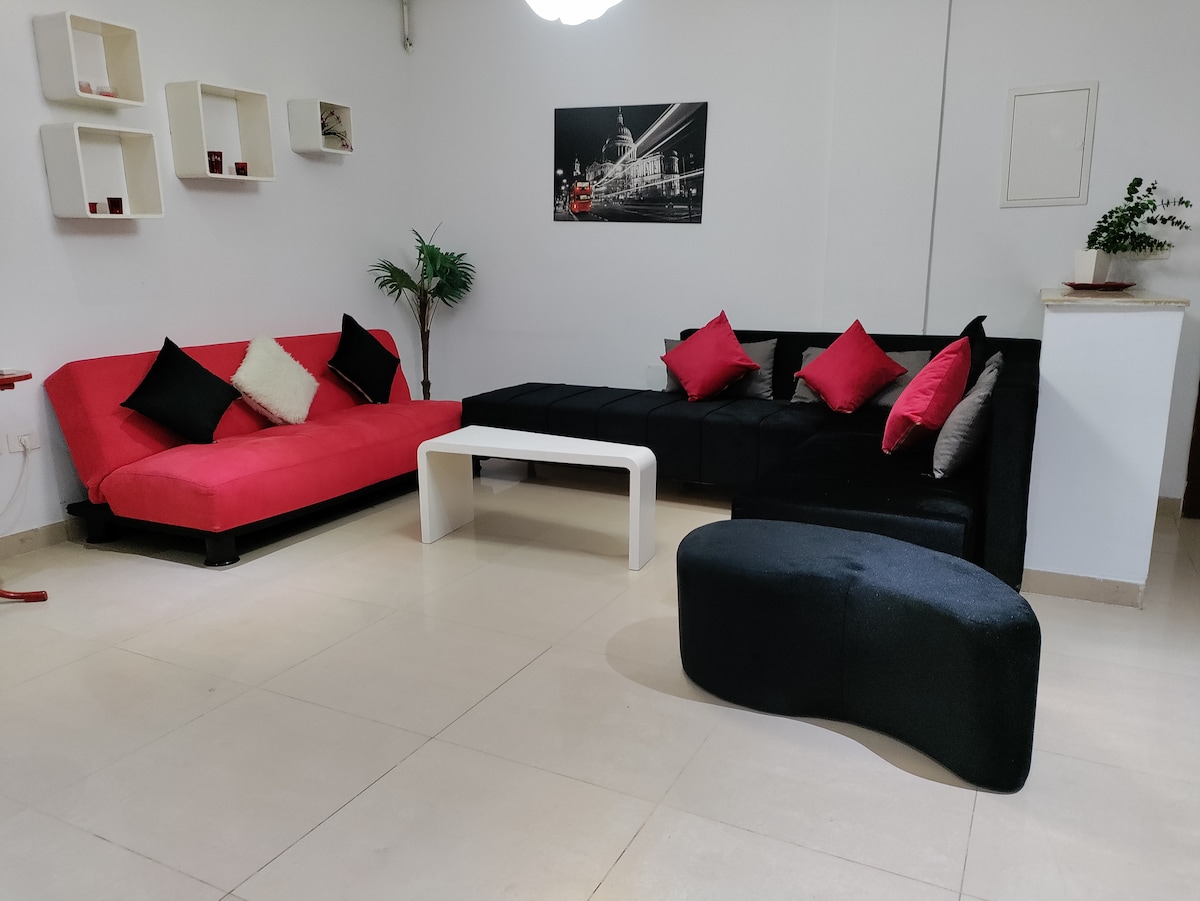 Appartement S+1 avec Internet gratuit pour 2 adultes et 1 enfant. Situé près des commodités et de la zone touristique de Nabeul, à 3 min de la plage et en centre-ville. Sécurisé par des caméras de surveillance et équipé d’un climatiseur, dans un quartier calme. Cuisine ouverte : réfrigérateur, cuisinière, four, machine à laver et coin café. Salle de bains complète et coin vert avec petit jardin Extras : garage spacieux avec caméra de surveillance, porte automatique, SDB,kitchenette 5€ par jour
