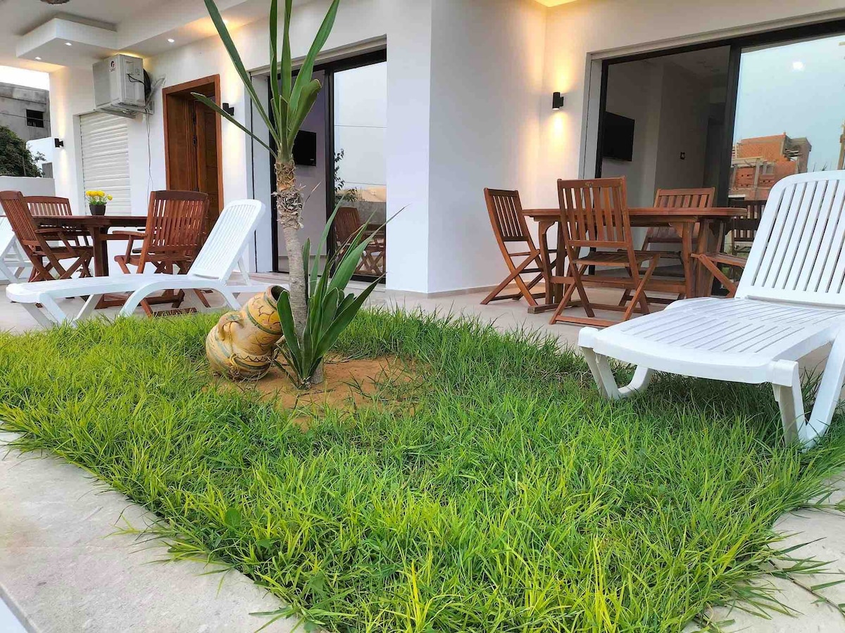 S+1 fraichement construit de haut standing et meublé avec gout au rez de jardins, avec accès à une terrasse. Situés au Cap Bon à Ezzahra (7km de Kélibia). Un endroit tranquille, paisible et sécuritaire. L'appartement S+1 possède 1 chambre fermée avec un dressing et un grand lit. Un salon et cuisine à air ouverte avec une grande porte fenêtre qui donne sur une terrasse avec barbecue Distance de la plage: 1 minute de marche