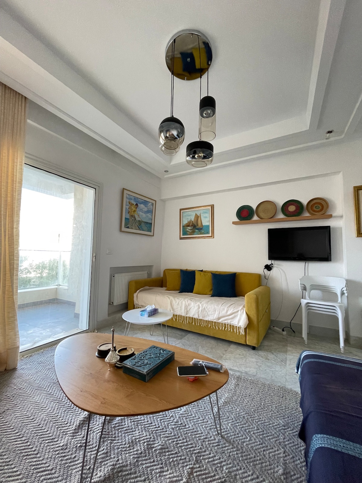 Un studio charmant pouvant accueillir 2 à 3 personnes. Vous y trouverez une grande terasse, pour des repas avec vue (barbecue ).Ce studio à la vue imprenable sur le Golfe de Tunis, se situe au cœur du village de Sidi bou Saïd. Vous aurez l'occasion de découvrir l'architecture unique de ce site inscrit au patrimoine mondial de l'unesco. Les maisons bleues et blanches,Le palais du Baron d'Erlanger, le café des délices chanté par Patrick Bruel, les vues uniques, seront tous au rendez-vous!