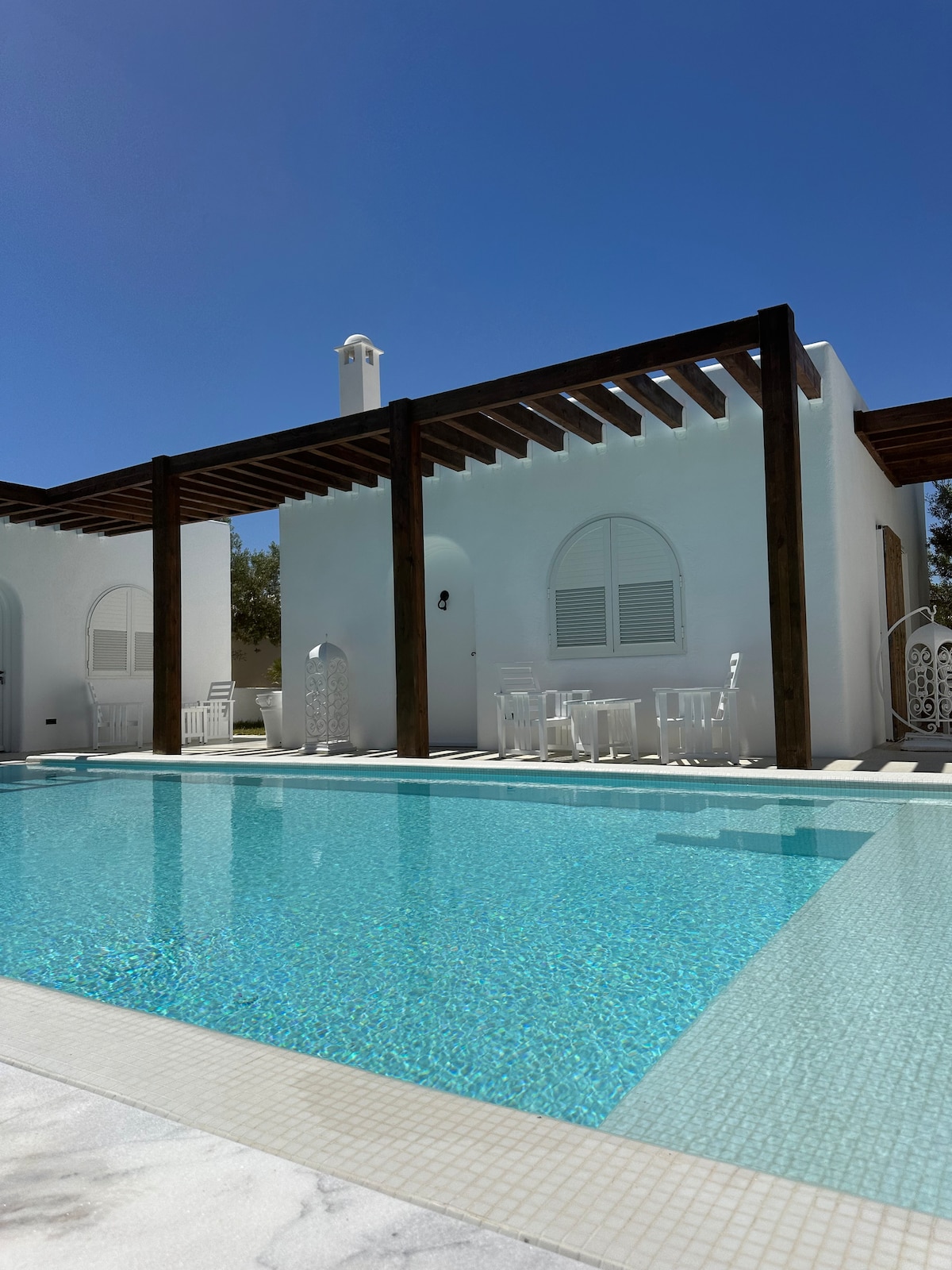 Résidence de caractère rénovée décoré dans le style minimaliste épuré d’Hammamet et revisité dans le style Mykonos (voutes croisées, fer forgée en noir) • Espace commun avec salon, coin repas face à une grande piscineChambre climatisée en même temps elle dispose d'un ventilateur suspendue style art-déco donnant sur une piscine privée le lit est construit dans l style Mykonos le sol est repeint à l'époxy blanc dans ce logement paisible et central. le séjour qui donnent sur une belle terrasse.