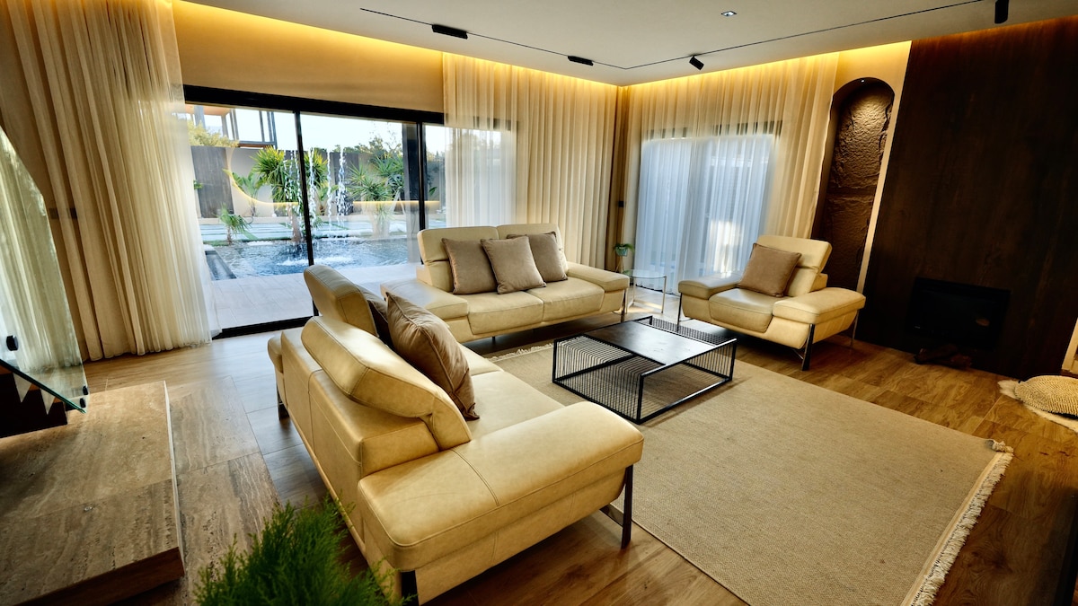Our villa is located 3 min drive from Hammamet theater. The entrance has private pool, big garage and spacious garden. The ground flour has comfortable saloon equipped with TV, AC, charming black marble fireplace and comfortable sofa’s together with a window door opening onto the pool. It also has a modern well equipped kitchen, dining place, a bathroom and an extra guest room equipped with a dressing. The 1st floor has 3 master suites all equipped with AC, balconies & private bathrooms.