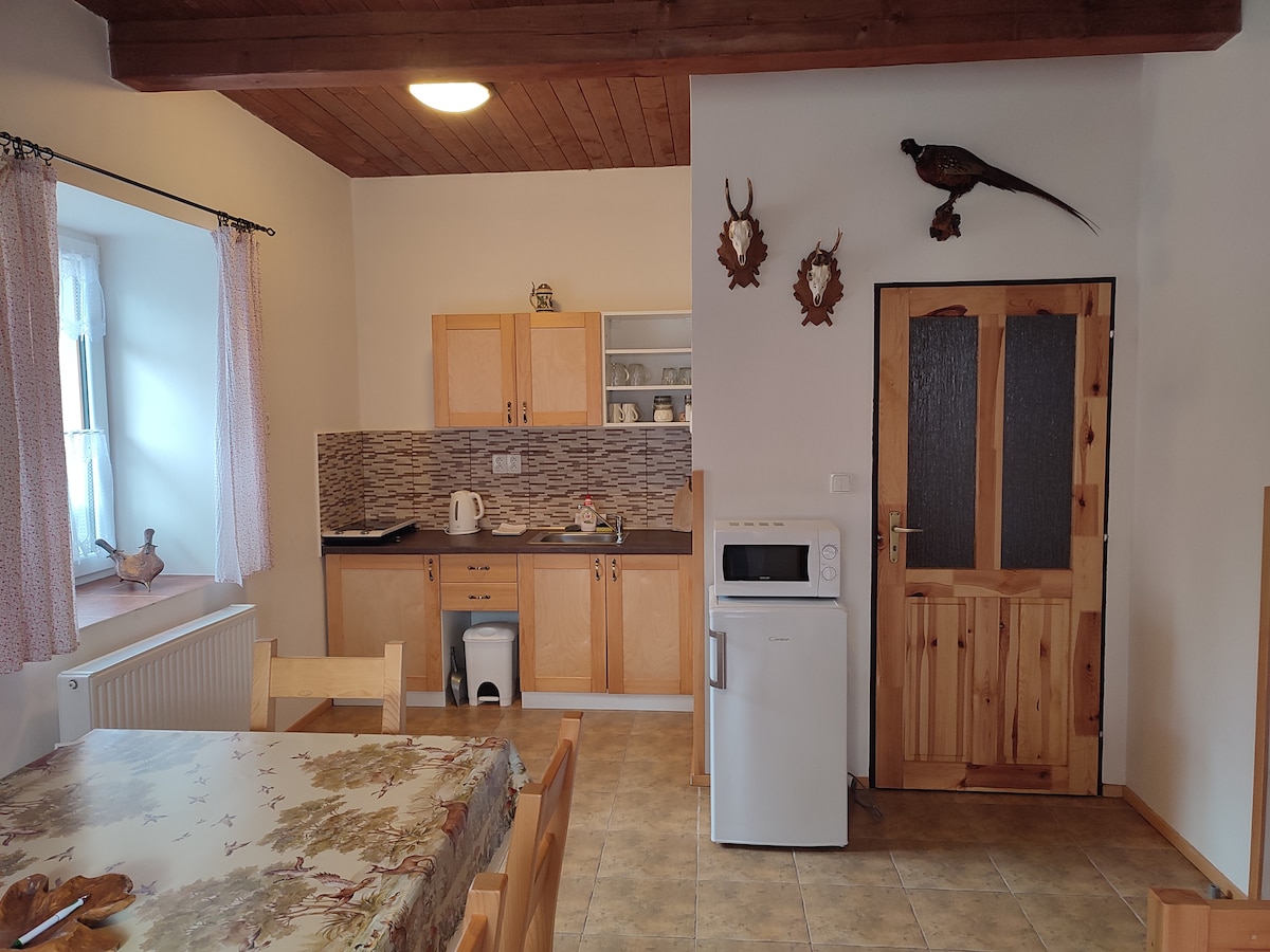 Spacious first floor apartment with a large garden in the centre of a small village near Adrspassko-teplicke rocks. A great starting point for both small and big journeys in this lovely region. Easily accessible by car, train or bus. Comfortable accommodation for up to four people (children's bed and a baby cot available on request). Our guests are welcome to enjoy all the perks of our garden, including strawberries, blueberries, etc. A small shop and a small inn are just across the road.