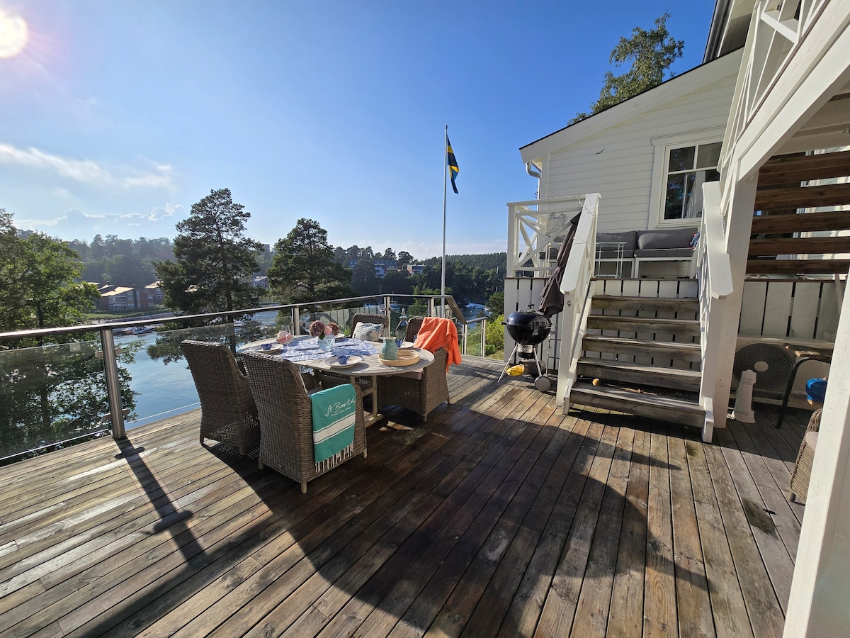 Our stunning home was completed in 2013, it is built on a cliff overviewing the waterways leading into Stockholm. South aspect with views stretches from east to west. Private beach, jetty and wood fired sauna . The house has one master bedroom, 2 bedrooms plus a small cabin (guest house, bedroom no 4, available summer time only). The deck has a lounge, hot tub, outdoor kitchen and open fireplace/BBQ. We are located 30 min from downtown Stockholm, 10 minutes from a shopping centre.