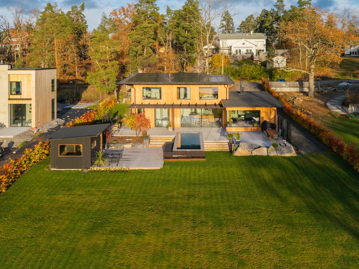 Modern mini villa built 2022 just by the ocean with fantastic view over the bay and archipelago. Beachfront with private jetty just below the house. Boat, kayaks, SUP´s and bicycles at your disposal. Totally 48 sqm split on lower floor with hall, master bedroom and bathroom, upper floor with living room, fully equipped kitchen and small bedroom with bunk bed. Sliding doors to balcony & terrace. Close to Tyresö castle & Tyresta National Park. Stockholm city only 21 km. Good public transportation.
