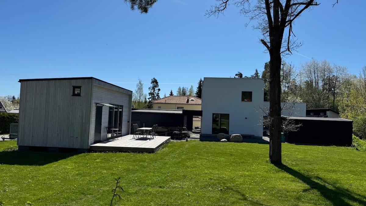 New (2018) mini-villa in Skuru, Nacka Mini-villa with all amenities such as dishwasher, washer dryer, Air conditioning, Floor heating, LED TV, Wifi etc. Large sleeping loft with 180 cm wide bed. The sofa in the living room is a fold out bed which sleeps two people (140 cm wide). Two roomy terraces, both with furniture and tables. We have a brand new (Nov 2022) trendy Airbnb next to the Mini-Villa, with bedroom on the same floor. search: "New modern Studio close to Stockholm with parking".