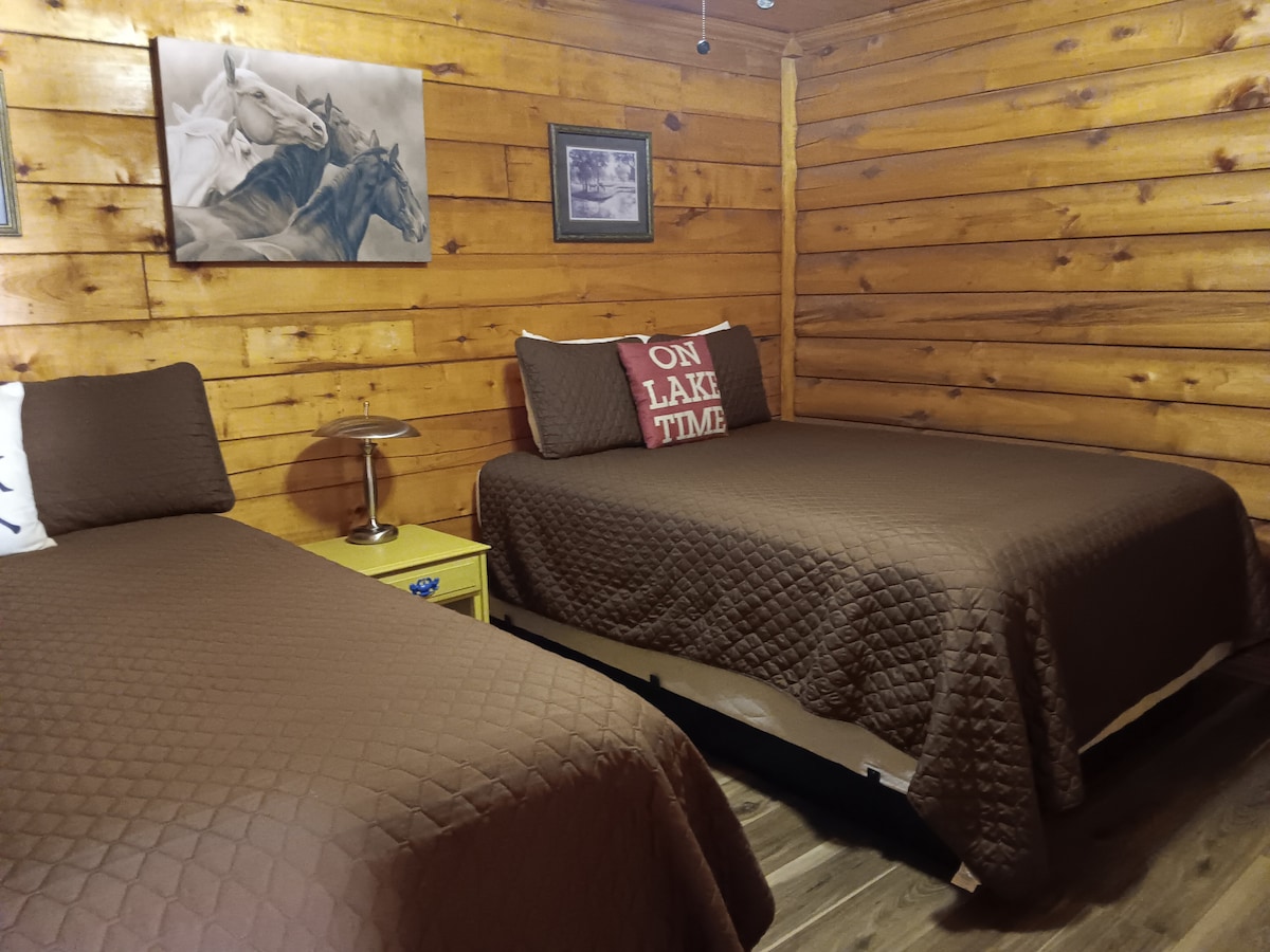 Dogwood Cabin at Tall Timbers Retreat sleeps up to 13 (or 9 in individual beds). Downstairs has a private room with a Queen bed and a pull-out full sofa. Upstairs has a private room with a King bed and a bunk bed, plus a loft with five singles (note: access to the private room is through the singles area). Two full bathrooms, one on each floor. It has a full kitchen and shared laundry access with Pine Tree Cabin. Cabins may be rented individually or as a group.