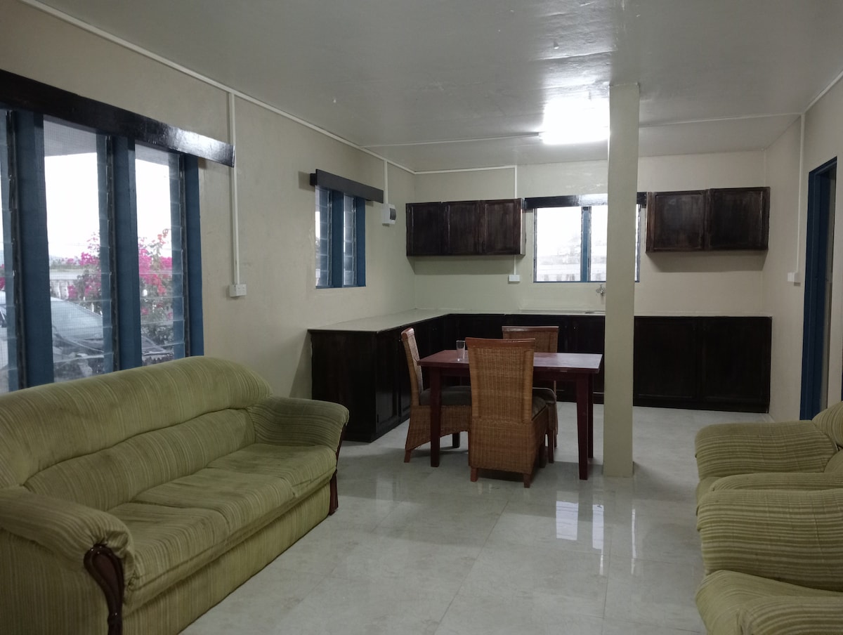 Prime location, well suited for transit in Nadi. Approx 7 minutes drive from Nadi International Airport. Is located after Nadi Event Centre, in Carreras Road, Votualevu. Building is adjacent to main road and close to all public amenities. Fully secured with CCTV Camera and electronic gate. 15mins away from Nadi Town. Self contained unit attached with private convenience, hot/cold bathroom, full A/C, all necessary facilities for cooks and cleans with private entrance and free parking space.