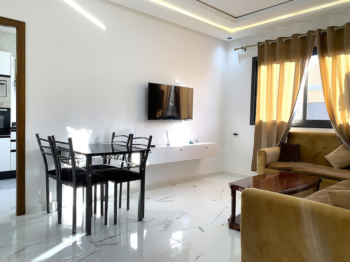 Appartement moderne et lumineux, parfait pour un séjour en famille . Il dispose de 2 chambres : une avec un lit double et une avec 2 lits simples, une cuisine équipée et un salon spacieux. Situé dans un quartier calme, il offre tout le confort nécessaire. Conformément à la loi marocaine, seuls les couples mariés sont acceptés. Vous bénéficierez également de la climatisation, du Wi-Fi et d’un espace propre et bien entretenu pour un séjour agréable.