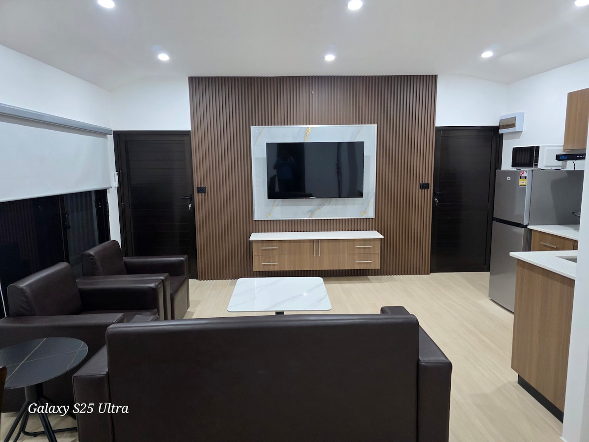 fully finshed apartment 1 Queen bed , air con, free wi-fi, smart tv , radio with USB player microwave, electric jug, toaster, sandwich maker, fridge/ freezer, washing machine, 6 chairs with Dining table,4 burner gas stove with oven, range hood, big Recliner leather sofa, ect.