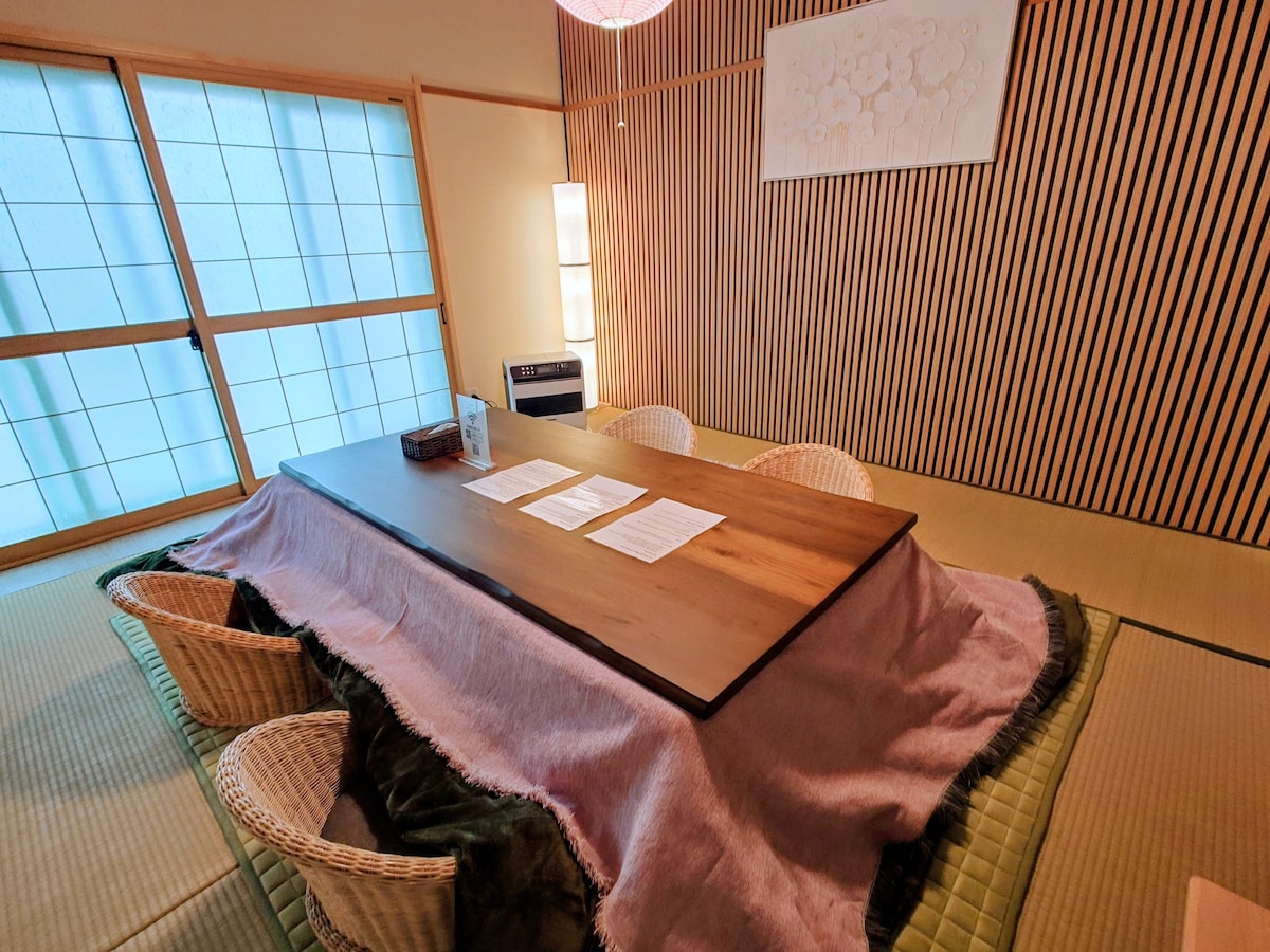 フルリノベーションにて伝統的な和の設えにモダンなデザインを合わせ、畳の心地よさとやわらかな照明に囲まれた空間をご用意いたしました。善光寺徒歩圏内、7名様までご利用可能な1フロア貸切の宿です。 3月はまだスキーも楽しめ、春の長野観光も満喫でき、観光・アクティビティ・食事すべてが徒歩圏で完結する便利な立地です。 1階の和食店では日本ならではの食体験もお楽しみいただけ、さらに周辺には居酒屋やカフェなど飲食店が多数あり、夜の街歩きも安心。*1階和食店は別オーナーとなります。 グループやご家族に最適な完全貸切タイプ。全室暖房完備で寒い日も快適にお過ごしいただけます。 ◎同ビル3階に【ヒカリとテラス 心 】(同タイプ・定員7名様)があり、 2・3階合わせ14名、グループでのご滞在も可能です。 https://www.airbnb.jp/rooms/1517186624195821172?photo_id=2381438099&source_impression_id=p3_1763175280_P3_V8J-0RRLMPaBT&previous_page_section_name=1000