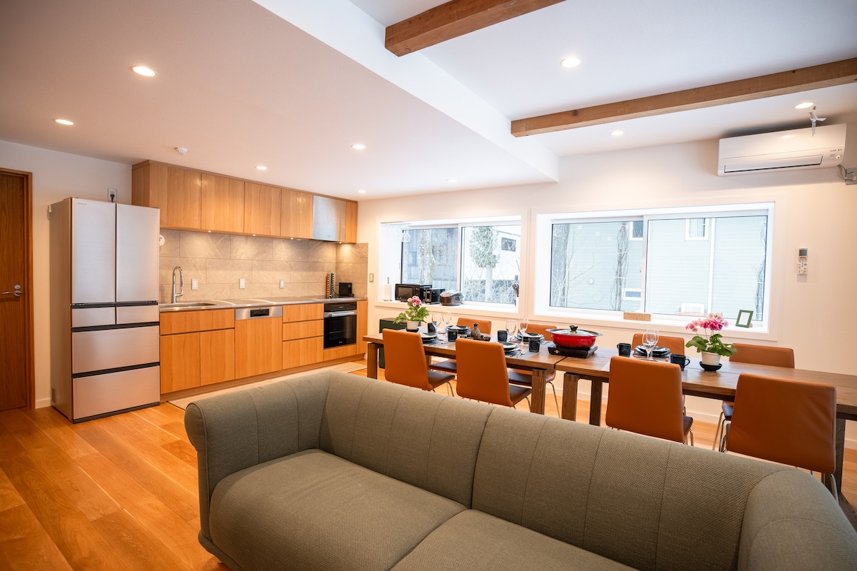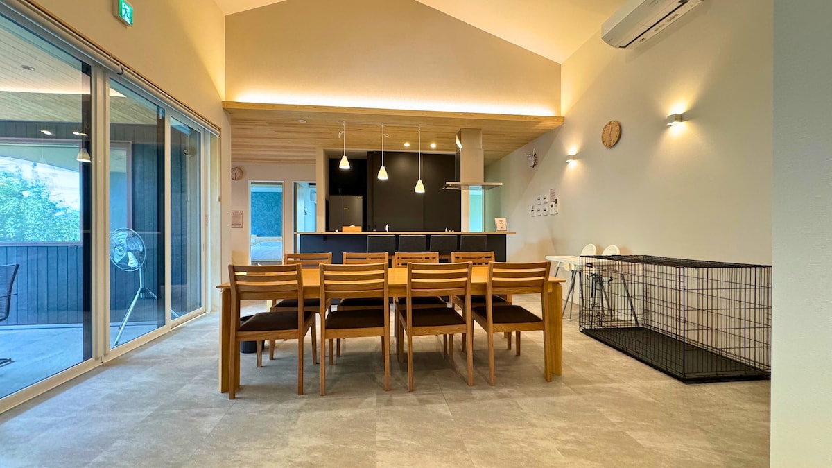 ★ Luxury Villa in Karuizawa Highlands ★ Exclusive villa at 1000m elevation on 1070㎡ property. 3BR+study for up to 13 guests. ● Pet Paradise 500㎡ fenced dog run, indoor pet toilet, amenities included. ● Premium Comfort High insulation, floor heating, AC, Serta double beds. Kitchen, WiFi, Netflix, BBQ, EV charger, 3 parking. ● Prime Location 15min to Old Karuizawa, 10min to Hoshino, 12min to station. Enjoy starlit dinners, misty mornings, and bonfire gatherings with family, friends, and pets.