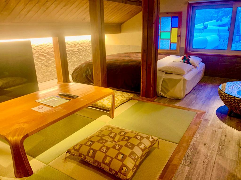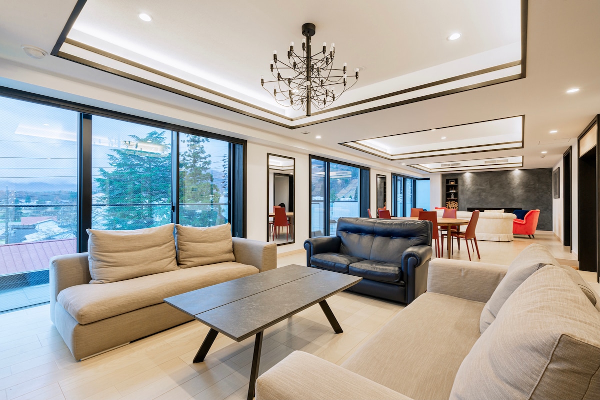 This is a stylish "Hiding Place for adults" expressing unique "Japanese modern"style. The rooms feature low ceilings, elaborate indirect lighting, antique glass windows, thick beams, and Ryukyu tatami mats, all of which are stylish. 65-inch LCD TVs, DVD players, and Bluetooth speakers are also provided. The bathroom, kitchen, and laundry facilities are functionally arranged to accommodate extended stays.