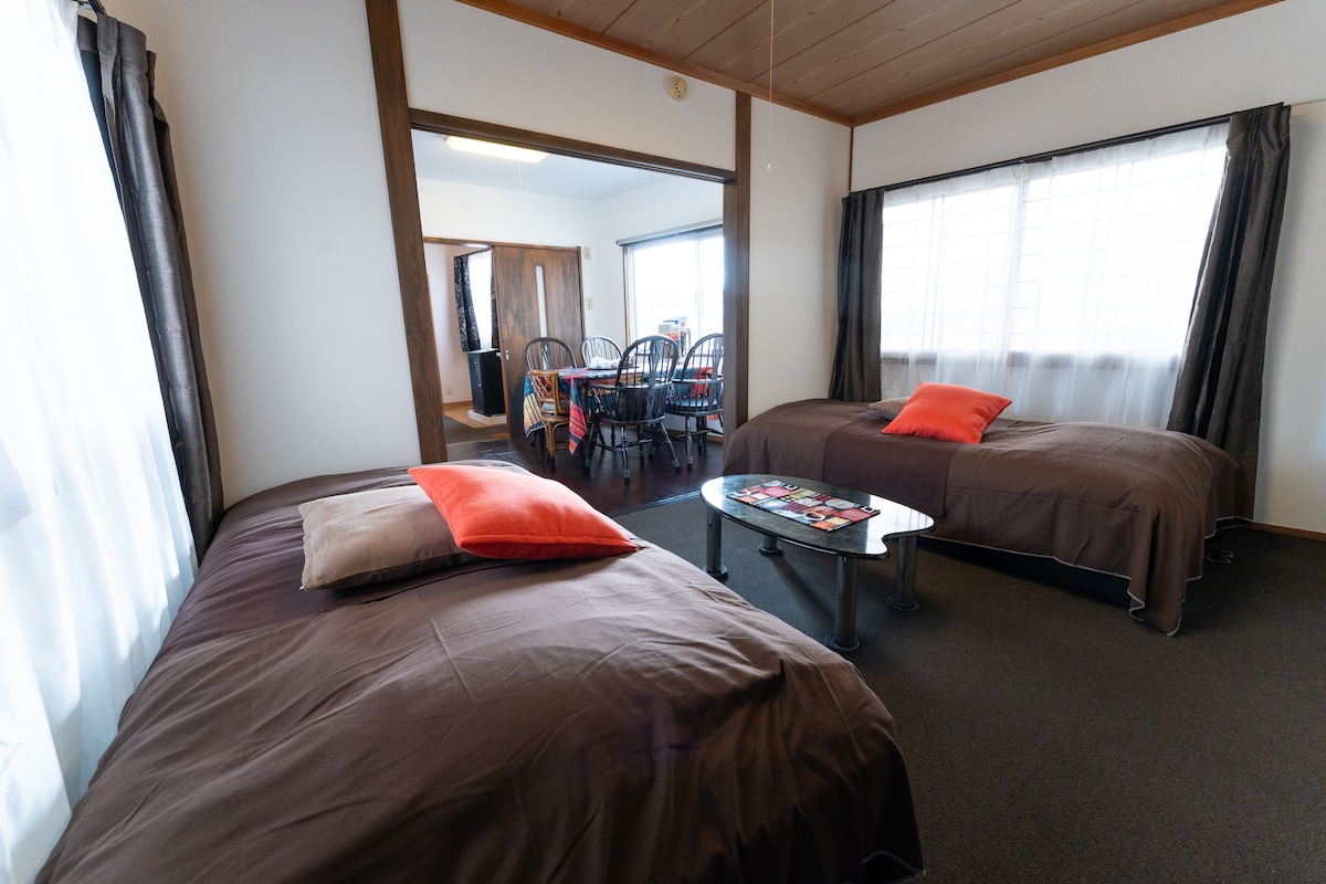 Popotel oneは、松本城の目の前にたたずむ、世界中から集めたアンティークで彩られた築100年の古民家です。 3ベッドルーム・最大12名で泊まれる大きな家は、丁寧に手入れされた居心地のよい空間です。 異国の魅力と日本の静寂が共存する一軒家で、ゆったり過ごしてください。 この家はのどかで日当たりがよく、リビング・中庭・ベッドルームなど、一日を通してどこにいても気持ちよく過ごせます。 そこかしこに置かれた世界中のアンティークは、時代と空間が交差する独特の空気を作り出しています。 お風呂やキッチンなどの設備は古いですが、ていねいにメンテナンスをし続けてきました。 昔ながらの日本の生活を感じてください。 子どもに大人気の大きな2段ベッドの部屋や、松本城が見える和室など、異なる3つのベッドルームがあります。お気に入りのベッドルームを見つけてください! 松本はコンパクトで歴史ある街です。松本城などの観光地だけでなく若者に人気のカフェやレストランもあり、街歩きを楽しむことができます。 家から徒歩3分の銭湯で日本のお風呂文化を体験するのもおすすめです! どうぞ気軽に問い合わせてください。
