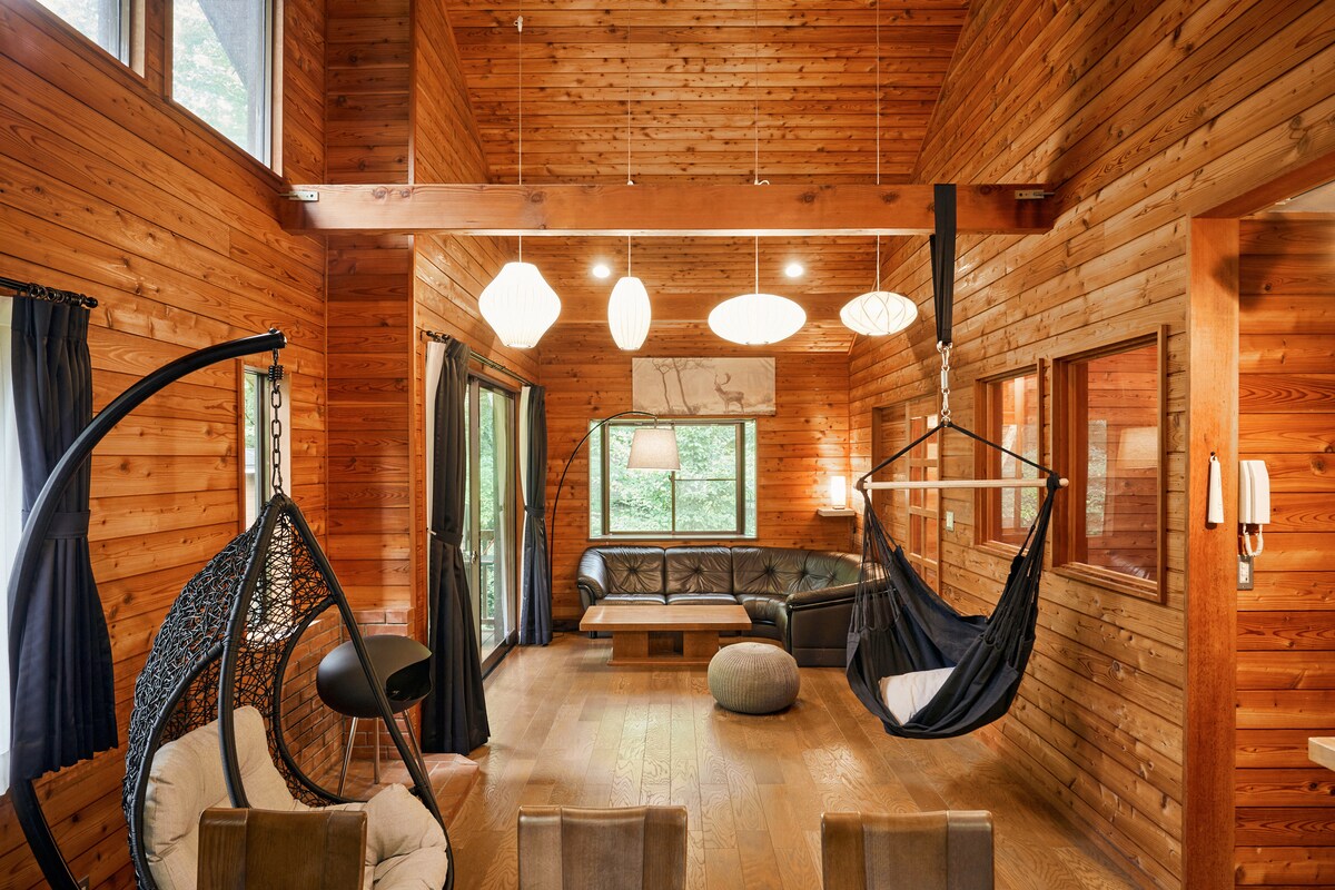 ジャパンディな別荘「リトリートヴィラ鬼の泉水」 軽井沢駅から車で30分、草津まで車で30分、近くには温泉へ車で3分、軽井沢おもちゃ王国まで車で7分 標高1,200mの高原で、夏は涼しく過ごせます 屋内では2階にある広いリビングでソファーやハンモックチェアで寛ぎながら、75型TVで映画等を楽しめます。 家族4人で入っても余裕がある和風の大型お風呂は入る価値あり!ブラインドを開ければ外の緑を楽しみながら入ることもできます。 2階リビングから繋がるバルコニーでは雨でも問題なくBBQができます。大型グリルで10人以上でバーベキューも楽々 <リトリートヴィラ鬼の泉水の魅力> ・天井高4mの吹抜けリビングがある和風モダンな室内 ・家族4人が一度に湯船に入れる和風の大型風呂 ・75インチの大型TVで映画やゲームも非日常感 ・2階リビング直結の大型バルコニーで、雨でも楽々バーベキュー。リビングと一続きなので、大人数でもバルコニーとリビングを活用して屋内BBQが楽しめます。 ・寝室は3つ、複数家族、お友達、クラブ、サークルなどで楽しめます