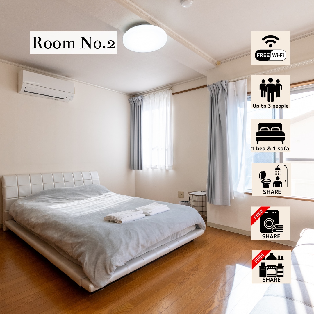 駅近の一軒家。3階建ての建物で寝室が個室となります。他のお部屋には他のゲストが宿泊し、共用エリアがあります。 (トイレ、シャワー、リビング共用、個室寝室) 中津川駅から徒歩約4分、コンビニまで徒歩約2分。 馬籠トレイルに最適 エントランスに無料のロッカーがあり、チェックイン前チェックアウト後に利用可能です(数に限りがあります) 【Room No.2】1-3名部屋 ・2階のお部屋です(階段) ・約6畳(約10.8平米)個室は寝室のみ ・ダブルベッド1台あり、すぐにくつろげます ・エアコンあり ・ソファーベッド1台あり(3名利用時セルフベッドメイク) ・冷蔵庫、冷凍庫あり ・ヘアドライヤーあり 専用アメニティー ・バスタオル、フェイスタオル、バスマット、歯ブラシ、ティッシュ、スリッパ 【共用スペース】 玄関、キッチン、リビング、TV、洗濯機、乾燥機、お手洗い 【駐車場】 ハウス内ガレージは使用不可。近くのコインパーキングをご利用ください(打ち止めあり)