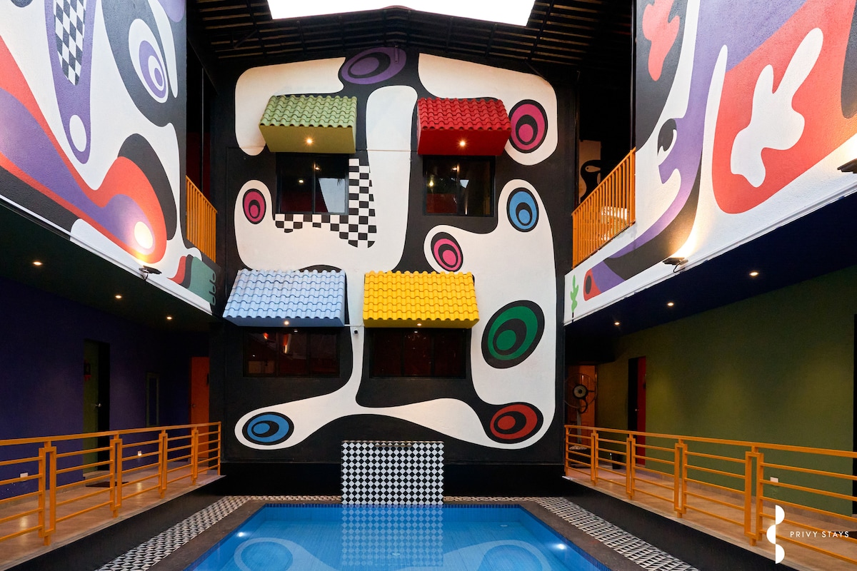 A bold and vibrant escape, this funky 7-room stay is unlike anything you’ve seen before! With its eye-popping exterior, colorful vibes, and artsy design, it’s perfect for those who love something unique. Enjoy a refreshing dip in the pool, relax in the cozy dining space, and make your getaway truly unforgettable. This offers a vibrant and artistic atmosphere for guests seeking a memorable stay. The property features a spacious pool, a comfortable dining area, and thoughtfully crafted spaces.