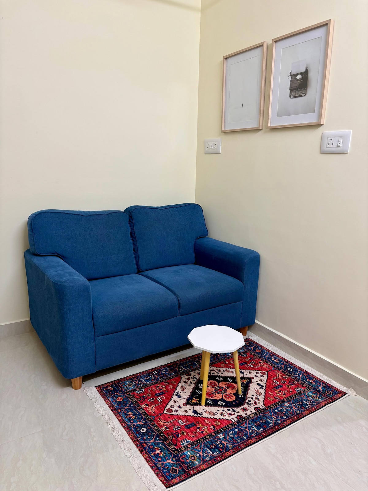 Spacious 600 square feet Designer 1BHK Suite with Private Balcony | High-Speed fibre optic Wi-Fi & Smart TV with streaming platforms, Work/Dining Desk, 24/7 power backup for uninterrupted work and comfort |Luxe King Bed & Orthopaedic Mattress ,wooden wardrobes for storage | fully equipped Kitchenette | Couch Bed in living room , Max.Occupancy 4 | Elevator access, professional housekeeping and access to paid laundry on site for long stays| Located in Central Bangalore | LGBTQIA++ Affirmative