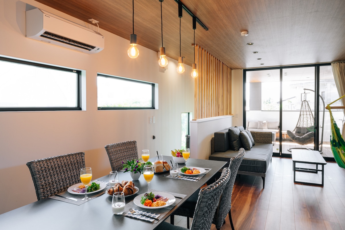 \家族の絆を深める、海辺の貸切一軒家/ 2025年8月オープンの一軒家で、家族だけの特別な休日を。 ビーチまで徒歩約2分という絶好のロケーションで、お子様と一緒にいつでも青い海へ駆け出せます。 【準備いらずの美食体験】 お食事は、厳選食材が届くケータリングがおすすめです。 買い出しや調理の手間を省いて、家族団らんの時間をより贅沢に。 テラスやリビングで、自分たちのペースで心ゆくまでお楽しみください。 ※BBQコンロ貸出、ケータリングは事前予約制の有料オプションです。 【パパ・ママも笑顔になれる設備】 お子様がNetflixやボードゲームに夢中になっている間に、大人は本格的なバレルサウナと海風を感じる外気浴でリフレッシュ。 最大8名様まで宿泊可能なので、三世代でのご旅行にもぴったりです。 【観光も遊びもスムーズに】 話題の「JUNGLIA」まで車で約20分とアクセス抜群。 移動の負担が少なく、お子様連れでもアクティブに観光を楽しめます。 夜は星空ジャグジーで、周りに気兼ねなく「家族の時間」を存分にお楽しみください。