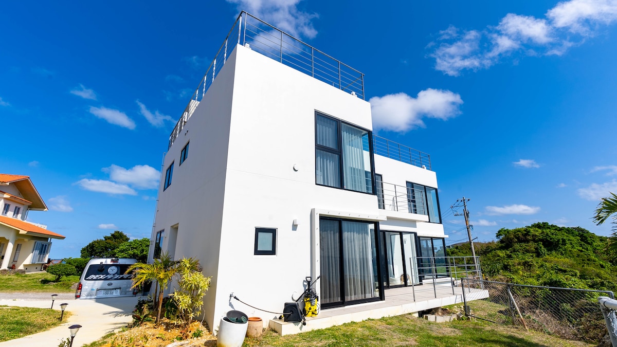 340度オーシャンビューの崖の上に立つ2022年9月新築の一軒家。 約100平米のすべての部屋がオーシャンビュー。お客様の使用可能エリアは2階の宿泊施設と、3階屋上のバーベキューテラスです。 各部屋に50インチ以上のテレビ、リビングには4Kプロジェクターと大型のスクリーンがあり、映画鑑賞も可能です。 外階段からつながる屋上にはバーベキューテラスがあり、サンライズも、日中のオーシャンビューも、夕方のサンライズも、夜の夜景と星空、月も楽しめます。海や自然の景色に癒されます。 屋上テラスにはトイレが完備されており、キッチンスペース、洗い場もございます。コンセントは8つ有り、IHを使った調理なども可能です。 2つある寝室には、ダブルベッドが2つずつ用意されており、最大8名様の宿泊が可能。 リビングにあるソファーにもシングルベッドサイズのスペース有り。 カップルでも、ご夫婦でも、ご家族でも、3世代のご旅行でもお勧めです。 周りはとても静かで、夜は虫の音色、フクロウの声、耳を澄ませば波の音なども聞こえてきます。 車で10分の場所に海中道路などがあり、マリンスポーツの拠点としてもお勧めです。