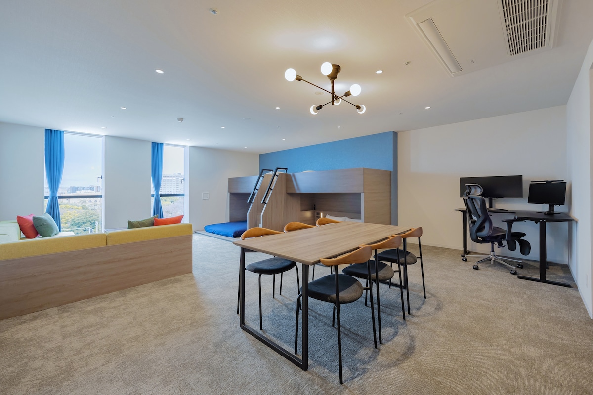 広々とした54㎡の客室には、ロフトベッド4台とソファベッド2台を備え、最大8名様までご宿泊いただけます。 2024年10月に名古屋市鶴舞公園南側に生まれる国内最大級のオープンイノベーション拠点にMinnが参画。たくさんのビジネスパートナーとも一緒の時を過ごせる広めの客室を持ち、ビジネスパフォーマンスを加速せます。ホテルフロント前の共有スペースには鶴舞公園を見渡せるルーフトップもあり、解放感も抜群。目前のスポーツフィールドからは活気が伝わってきます。 また、日本の中でもユニークな文化圏を持つ名古屋は、食の楽しみにも溢れ、日本の新しい魅力を感じる旅の目的地ととしてもお薦めです。 建物内にコンビニエンスストアあり。