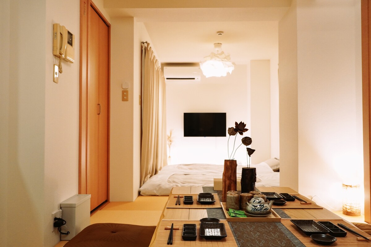 名古屋・千代田エリアの中心に位置する、和と洋が調和した癒しの宿です。 北側には畳の香りが落ち着く和室、南側にはダブルベッド2台を配したスタイリッシュな洋室をご用意しております。 キッチンやダイニングも完備され、電子レンジ、食器類、アイロン、洗濯機など生活に必要な設備がそろっています。観光にもビジネスにも便利。ご家族・ご友人とのご滞在はもちろん、ワーケーションにも最適です。 和モダンな空間で、心安らぐひとときをお過ごしください。 ささやかなお土産もご用意しております。