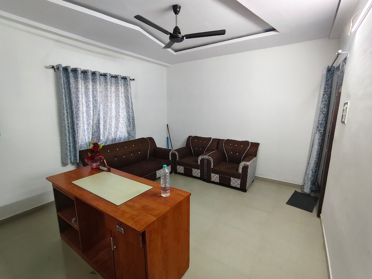 Relax with the whole family at this brand new apartment. Located only 5 km from the airport and surrounded by a scenic view from the balcony. The house is equipped with a TV, Refrigerator, water heater, water purifier and has a fully equipped kitchen for usage. It has a queen size bed and cupboard with locks for your valuables. Both local and outstation Guests are welcomed for their stay!!