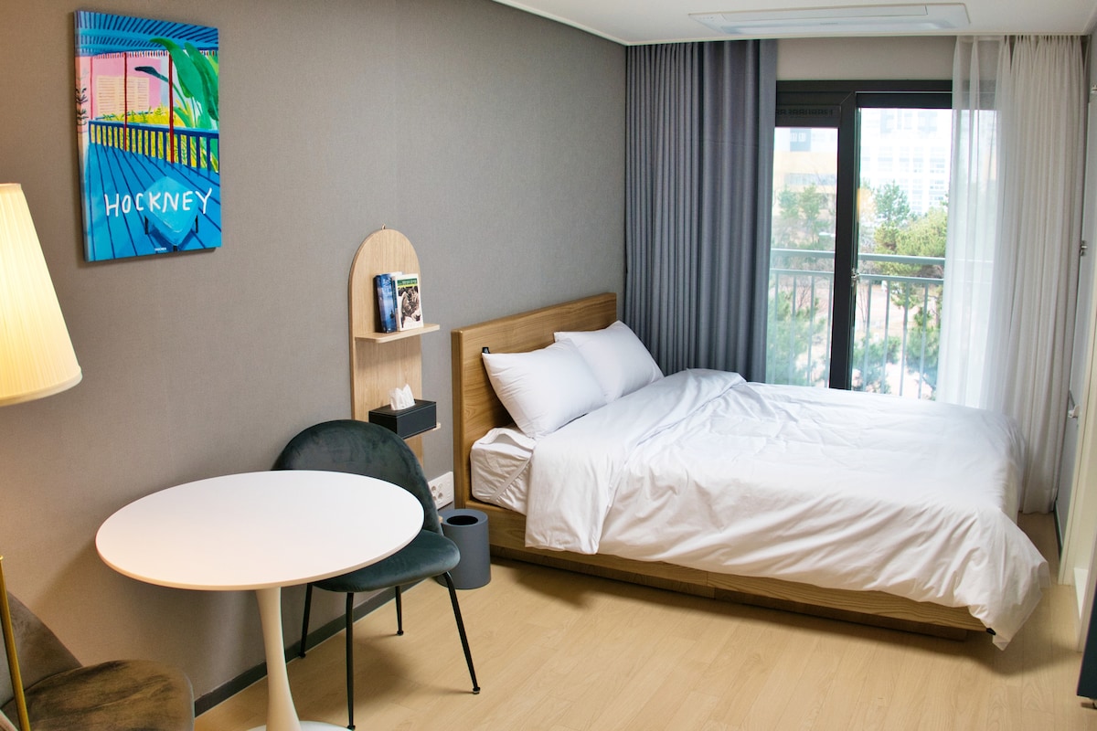 海景 [酒店 + 旅馆] 距离海滩 1 分钟 【连住20%折扣】 床上可欣赏海景 束草|中央市场 一周住宿折扣