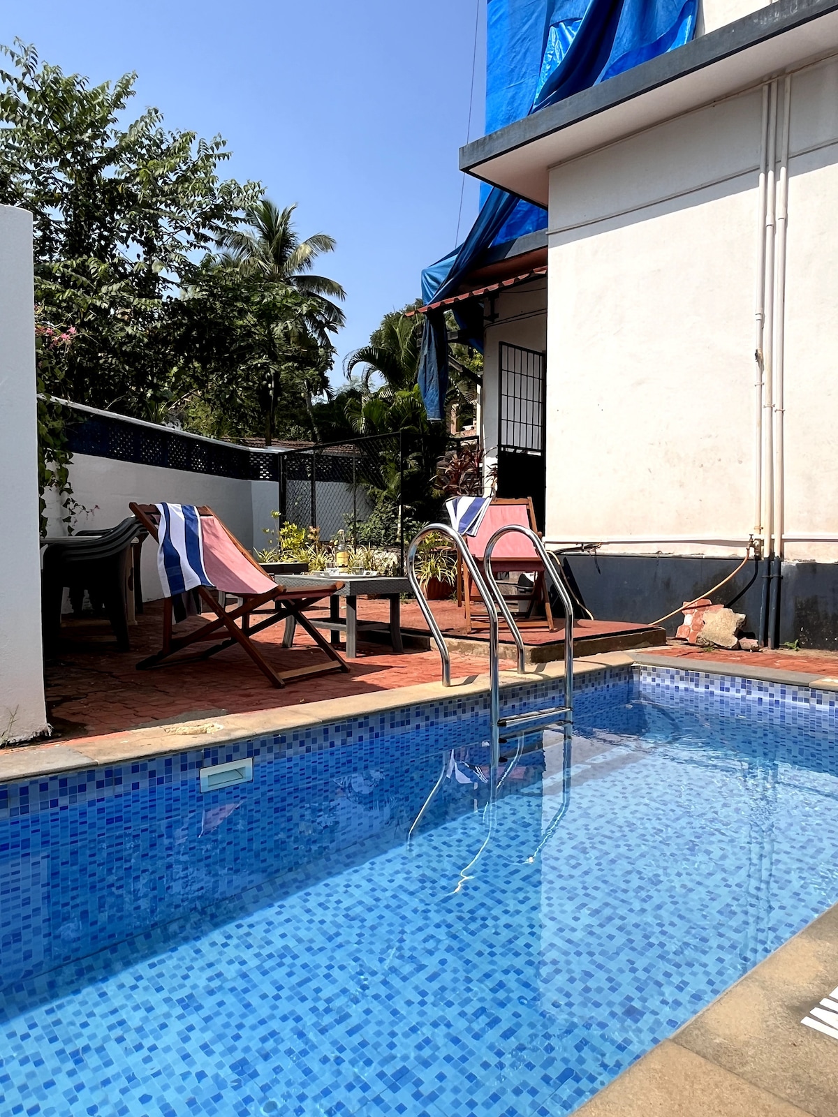 This beautiful house is centrally located in a luxurious gated community near Siolim. Perfect for friends or families. There's lush greenery in the entire society and also a Pvt Garden that wraps all around the house! Relax in the pool by the day and unwind with some chilled beers in our private garden in the evening! The house is just 10-15 mins from popular restaurants like Thalassa, Soro, Gunpowder, Jamun etc. A 15-20 min drive from popular beaches like Vagator, Anjuna, Morjim, Ozran etc.