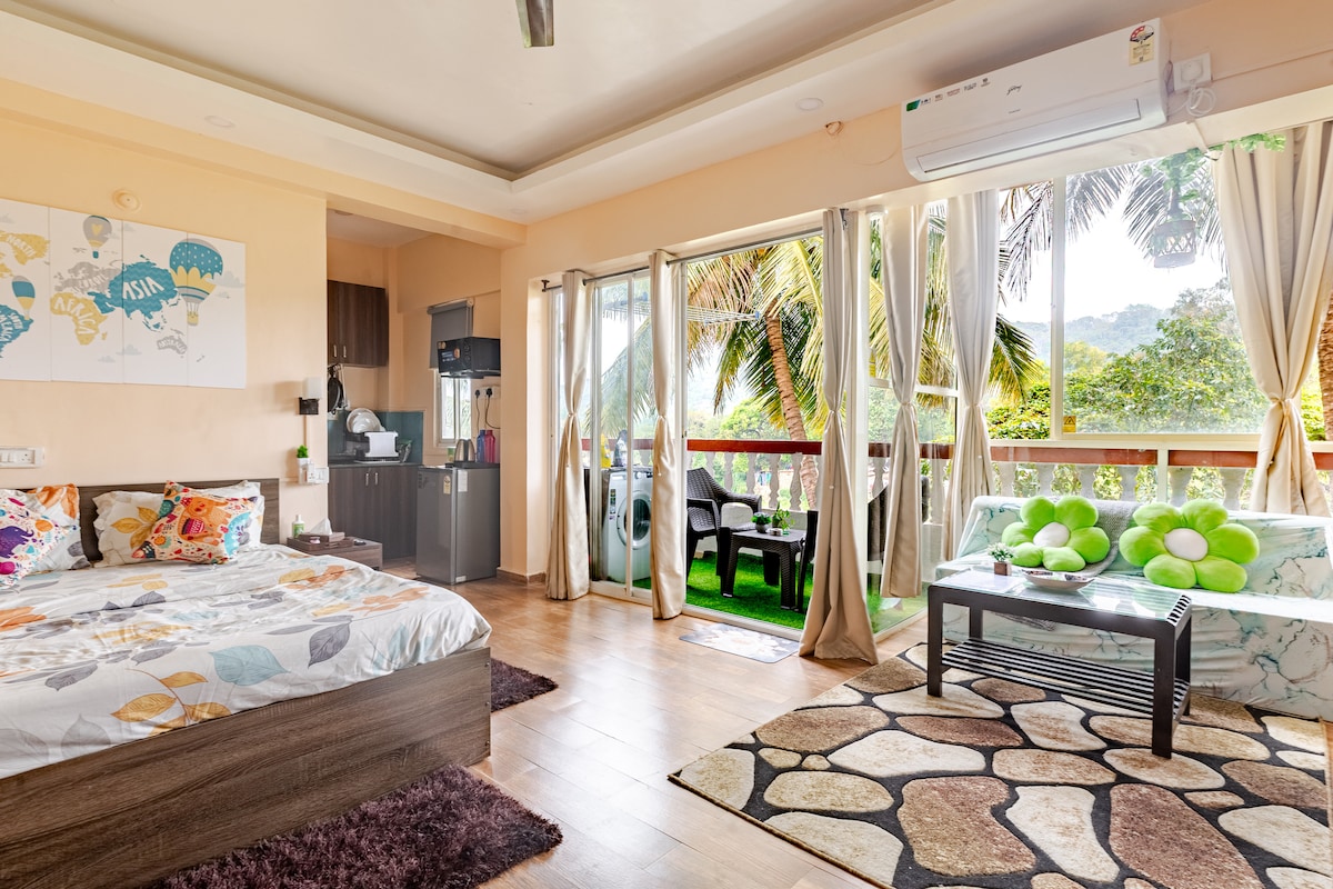 Modern studio in the heart of North Goa—10 mins to Baga, Anjuna & more! Superfast Wi-Fi, 43" Smart TV (with YouTube Premium ofcourse !!!, because we hate ads too!!), AC, kitchenette, sofa-cum-bed for extra guests & balcony with hill views (and maybe a peacock 🦚). Chill by the pool or hit the clubs—this spot does both. Peaceful vibes + party access = perfect Goa stay! 🌴✨