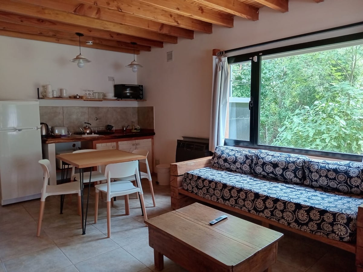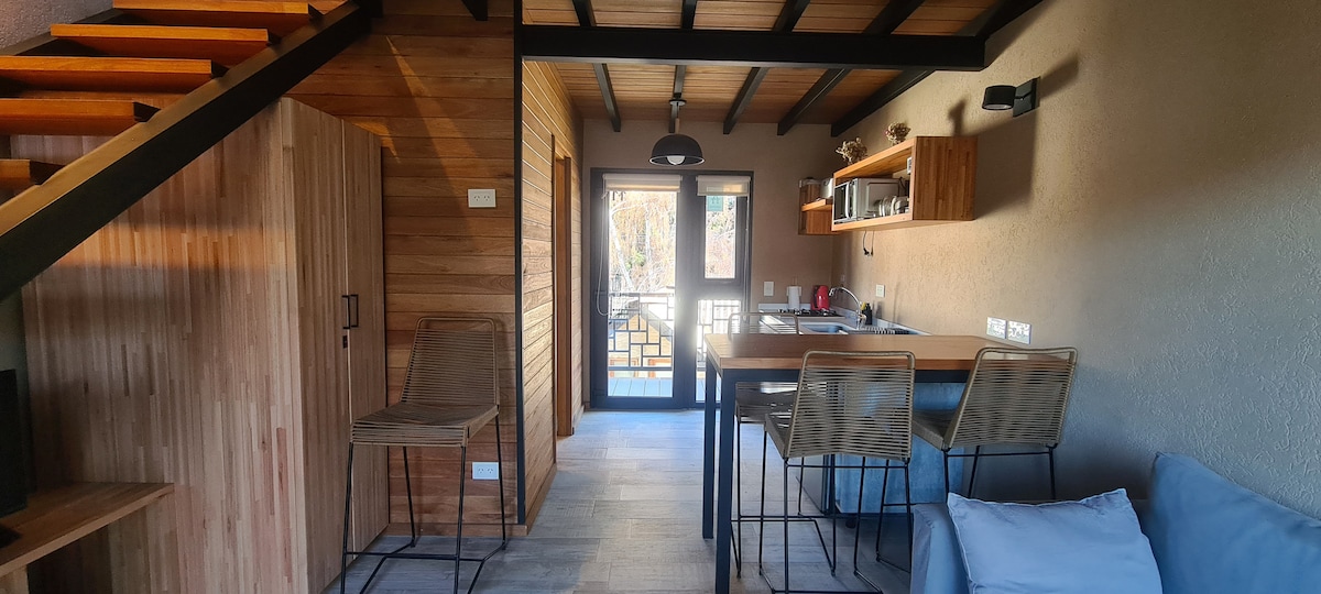 Loft de arquitectura moderna, con espacios integrados, amplios y grandes ventanales que permiten disfrutar desde el interior la imponente naturaleza. Estar, cocina y comedor integrados, cocina totalmente equipada para 5 personas En el estar, hay un futón que se transforma en cama de 2 plazas más una cama individual. El entrepiso cuenta con un sommier de dos plazas .