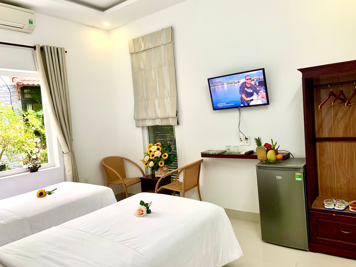 Bedroom: A queen-sized bed with super comfy mattress and a couch. Accommodation: The spacious room comfort for 2 people and a child under 7 years old with a total area of 20m2. Bathroom: The shower is furnished separately with the basin. Full utilities (shampoo, shower gel, towels, toothwares, hair dryer) and hot/cold water are always available 24/7. Window: All rooms have big windows full of lights and fresh air.