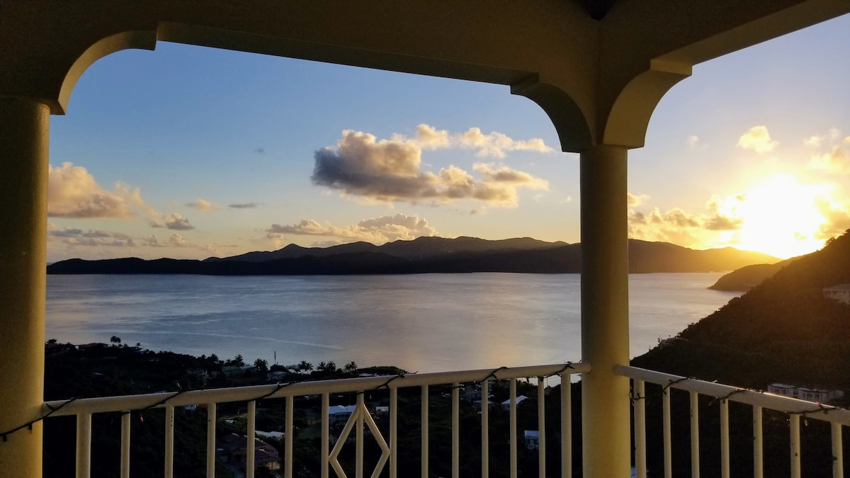 Wake up to panoramic Caribbean views in this elevated Penthouse Oceanview Oasis in Coral Bay. With an expansive private deck facing east over trade winds, sunlit interiors, and full AC throughout, this is the perfect escape for couples or honeymooners seeking serenity, spectacular sunrises, easy access to beaches, snorkeling, and top Coral Bay dining. Every detail — from the king-size bed overlooking the sparkling water to the BBQ grill at sunset - is designed for relaxation and lasting memories