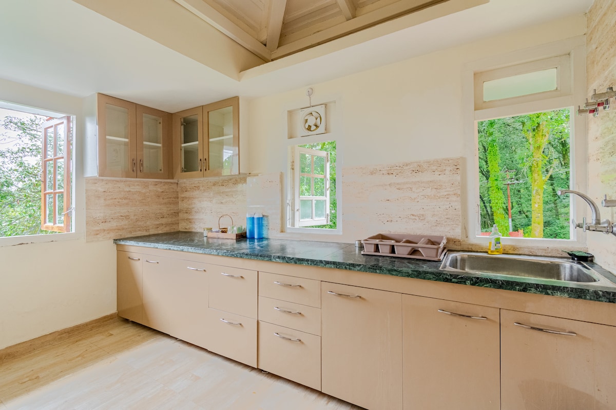 For 2 adults and two kids. A two- storeyed, A shaped Glass- Wood- And- Stone studio villa amidst an Avocado canopy and a small Kiwi vineyard and quite a few rare flower plants in the premise of our ancestral property. Vinatge setting, a fireplace, a freshwater spring, many ponds, a hammock and the constant chirp of birds to keep you company. Ideal for trekkers, readers, bird wacthers, nature lovers, meditation practitioners or people just looking for a quiet spot in a forest.
