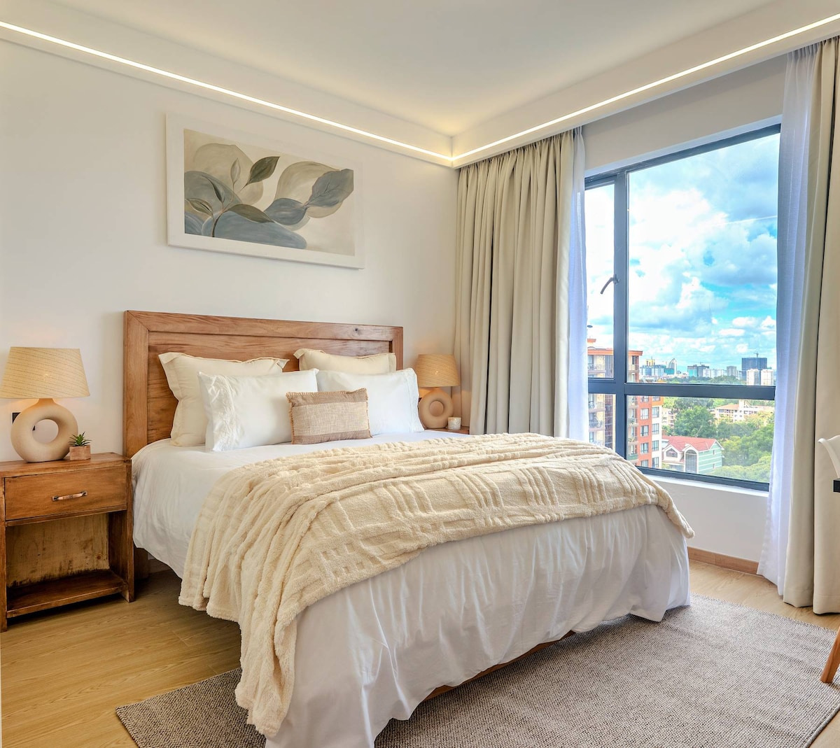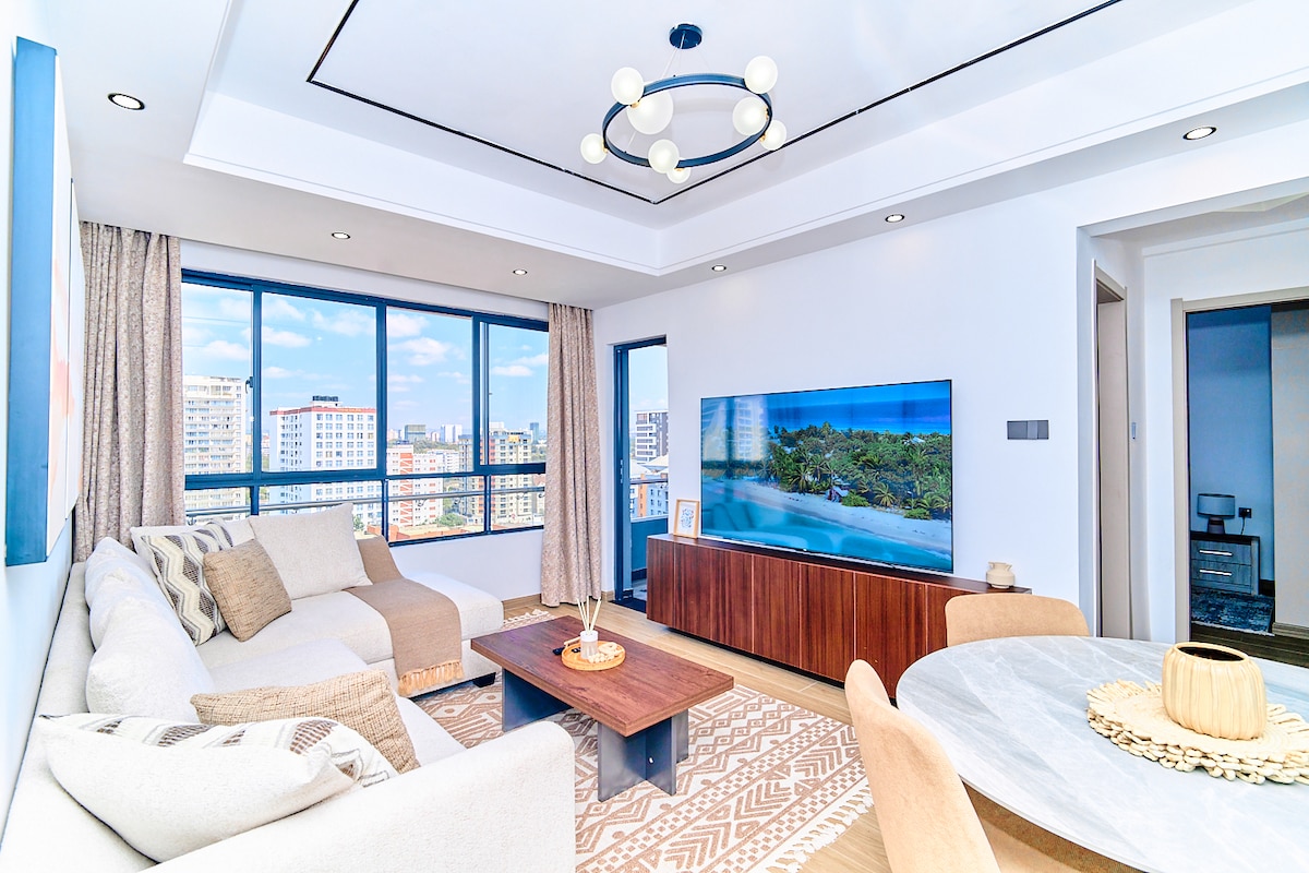 Escape to this 5* Elegant African Home with amazing modern decor on the 13th floor, offering breathtaking views of Lavington. Unwind with an 85” TV and streaming options like Netflix, HBO, and more. The master boasts a king bed, and the kitchen is fully equipped with modern appliances, including an espresso machine. Enjoy free parking, high-speed Wi-Fi, a balcony with sunset views, and access to a gym, heated pool, and rooftop garden—all with 24/7 security for peace of mind.