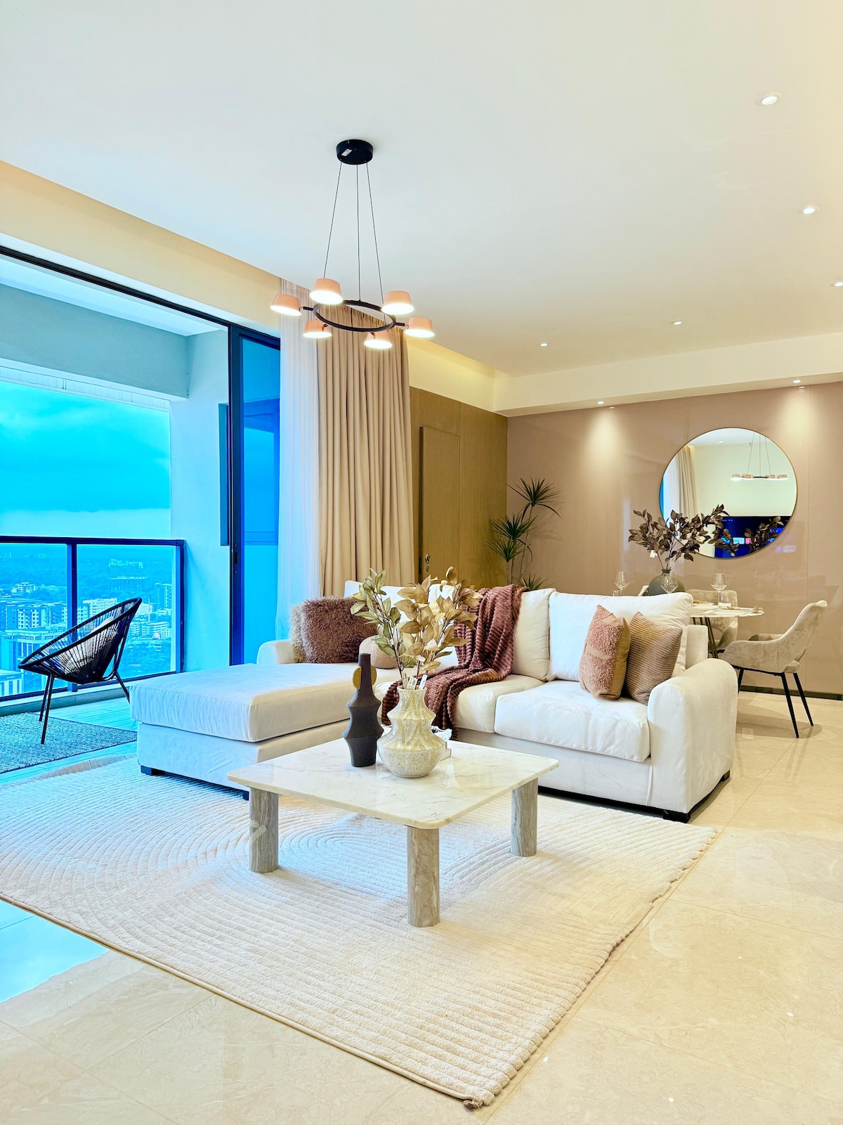 Nestled high above the city, this luxurious apartment offers breathtaking panoramic views of the bustling metropolis and captivating sunsets. More than just a home, it's an immersive experience of comfort, elegance, and unparalleled city living. As you step inside, you'll be greeted by an expansive living area bathed in natural light. The open-concept design seamlessly blends the living, dining, and kitchen spaces, creating a perfect setting for intimate family moments and lively gatherings.