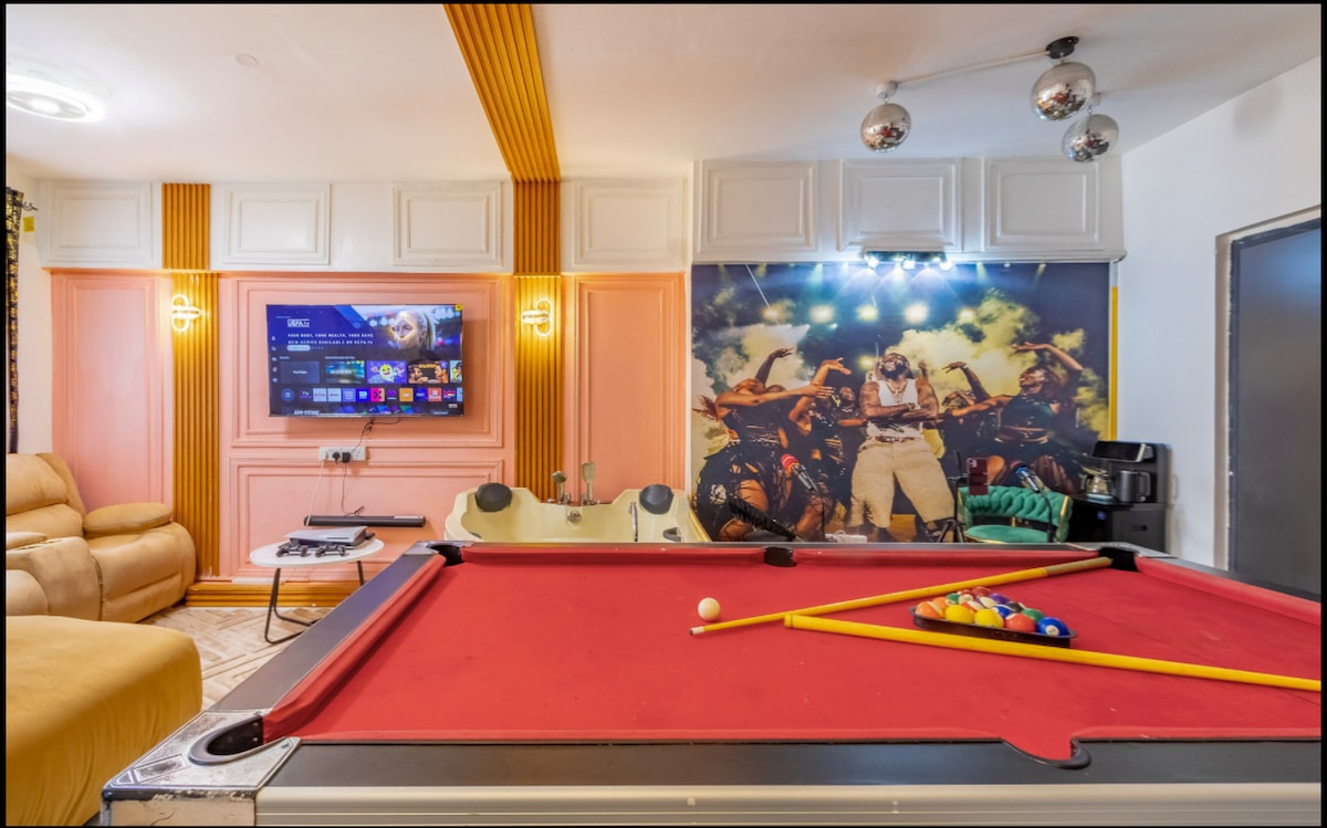 This unique place has a style on its own The 1-bedroom is a short-term rental packed with amazing amenities for an unforgettable stay. Immerse yourself in luxury with a hot tub, challenge friends to a game of pool, or unleash your inner performer on the karaoke stage. Enjoy your morning brew at the coffee bar, cozy up with Netflix on the big screen, and recharge with our wireless iPhone charging booth. Plus, indulge in the ambiance of Bluetooth bedroom LED lights, a washing machine & Netflix
