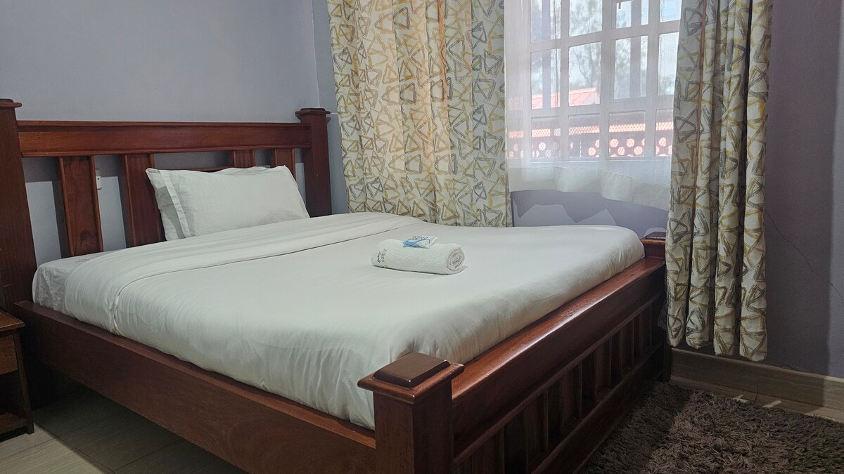Enjoy a stylish experience at this centrally-located place. It’s 3min from Bufallo Mall and 15min walking distance to town Hot shower always available and good lighting. Has a view of the lake from a distance and gets enough natural lighting. Wardrobes for your clothing and kitchen cabinet for snacks. The home is filled with Boho + Modern cosy vibes for your getaway. The place is very secure and in town.