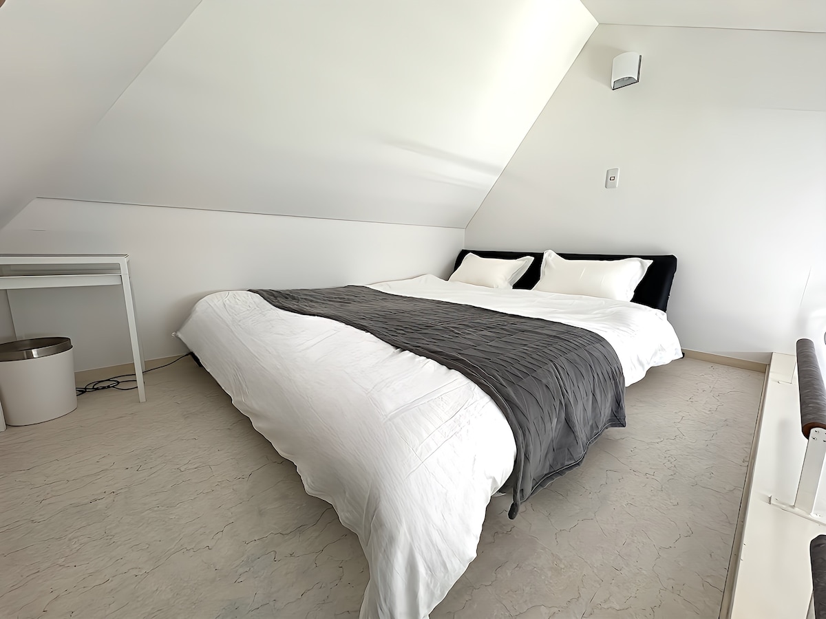 A serene, minimal loft just one stop from Shibuya and Roppongi—perfect for solo travelers or focused remote work. Featuring fast Wi-Fi, an Aeron chair, and a compact double bed (150×210cm)—ideal for one, cozy for two. The glass bathroom and sleek concrete walls give it a modern edge (note: some winter condensation—just run the bathroom fan). While there’s no closet, the space fits four large suitcases and includes a hanging bar and ten wall hooks to keep things tidy.Laundry service weekly.