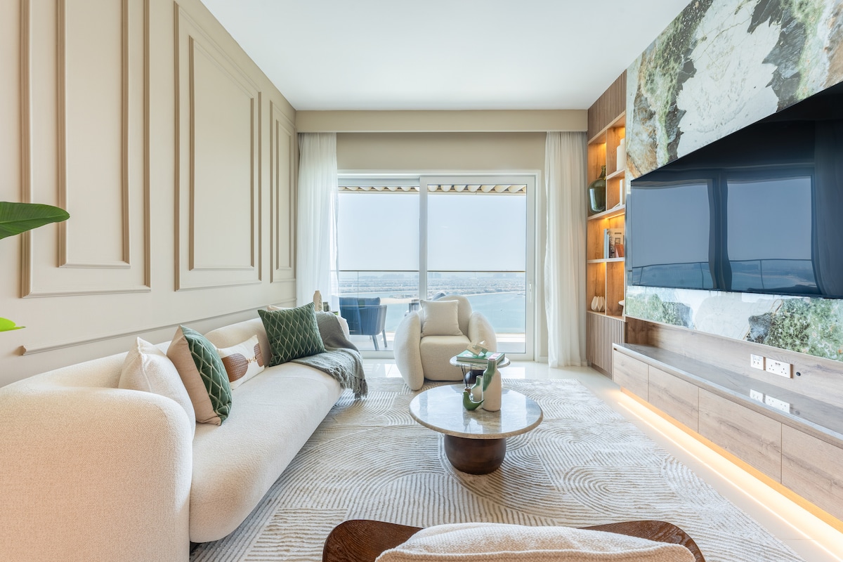 Mediterranean-inspired beachfront apartment in the heart of Palm Jumeirah, designed by the region's Top interior designers. This expansive residence boasts breathtaking 180-degree views of the ocean, framed by floor-to-ceiling windows. Step out onto the glass balcony to soak in iconic vistas of Burj Al Arab and Downtown. Indulge in ultra-luxury amenities within a five-star hotel setting, featuring a state-of-the-art gym, sauna, a spacious outdoor pool and exclusive private beach access.