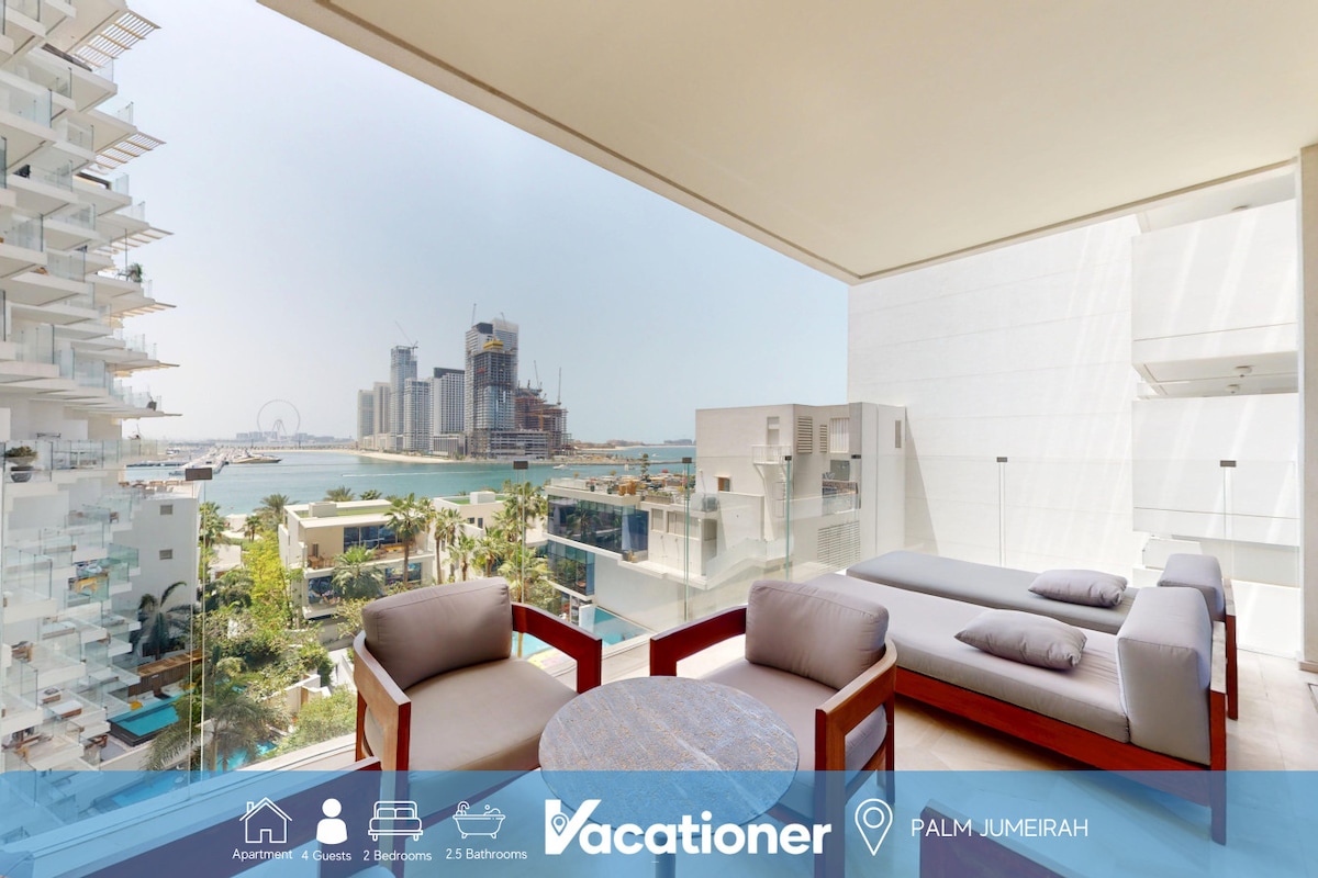 Located on the iconic Palm Jumeirah, guests can experience resort living at its best whilst staying in this opulent two bedroom apartment. Guests are treated to the five star amenities such as landscaped gardens, roof terraces, swimming pools, outdoor Jacuzzis, and a fully equipped Gym. There are also a number of restaurants and spa. If this wasn't enough, guests also have the luxury of the beach right on their doorstep.