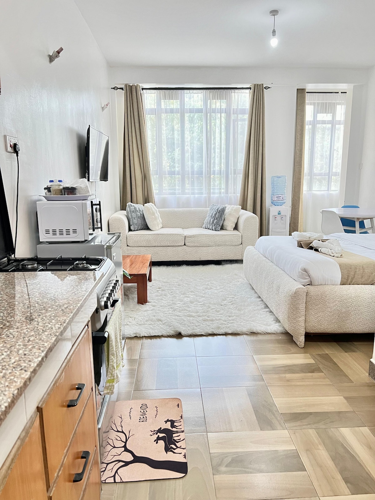 Modern executive studio in Nakuru CBD, perfect for guests attending conferences at Sarova Woodlands or visiting Lake Nakuru National Park. Enjoy a bright, cozy space with fast WiFi, smart TV, a fully equipped kitchenette, plush bedding, hot shower, and free secure parking. Easily accessible to malls, restaurants, and major roads;it is ideal for both work and leisure stays, with a calm atmosphere to unwind after a busy day.